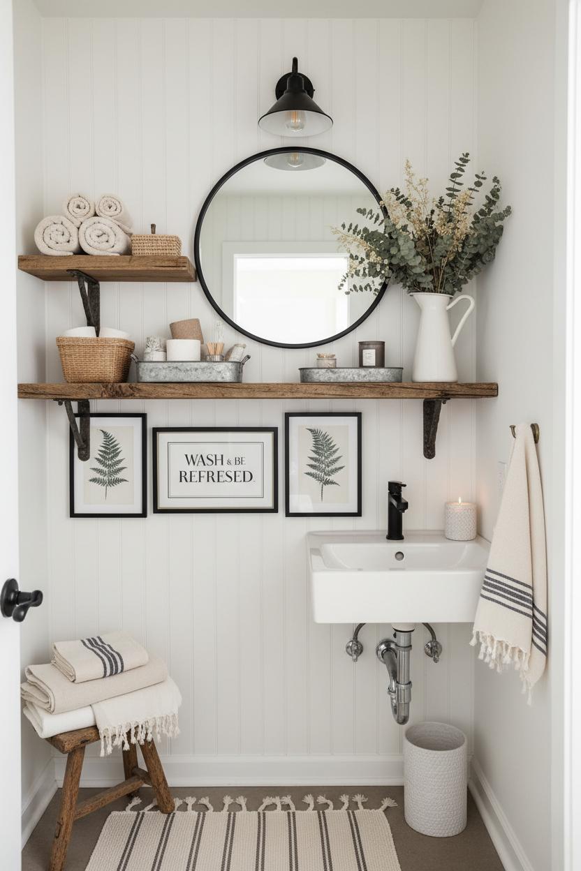Once the walls are softened, bring in warmth with reclaimed wood shelves. Their timeworn grain and not-too-perfect edges add an instant storytelling moment, especially when anchored with simple iron brackets. Style them with purpose: a neat row of rolled hand towels, a basket for extra toilet paper, and a small galvanized metal tray to corral everyday essentials—soap, a candle, maybe a little dish for matches. For a soft pop of life, tuck eucalyptus or dried meadow stems into a ceramic pitcher vase; it’s sculptural, practical, and a subtle nod to the garden. Layer in petite farmhouse wall decor, like a vintage-inspired sign or a pair of botanical prints, and let the shiplap wallpaper act as the gallery’s neutral canvas. The mix feels collected over time, like the best rustic home decor, where each piece earns its place because it’s both beautiful and useful.