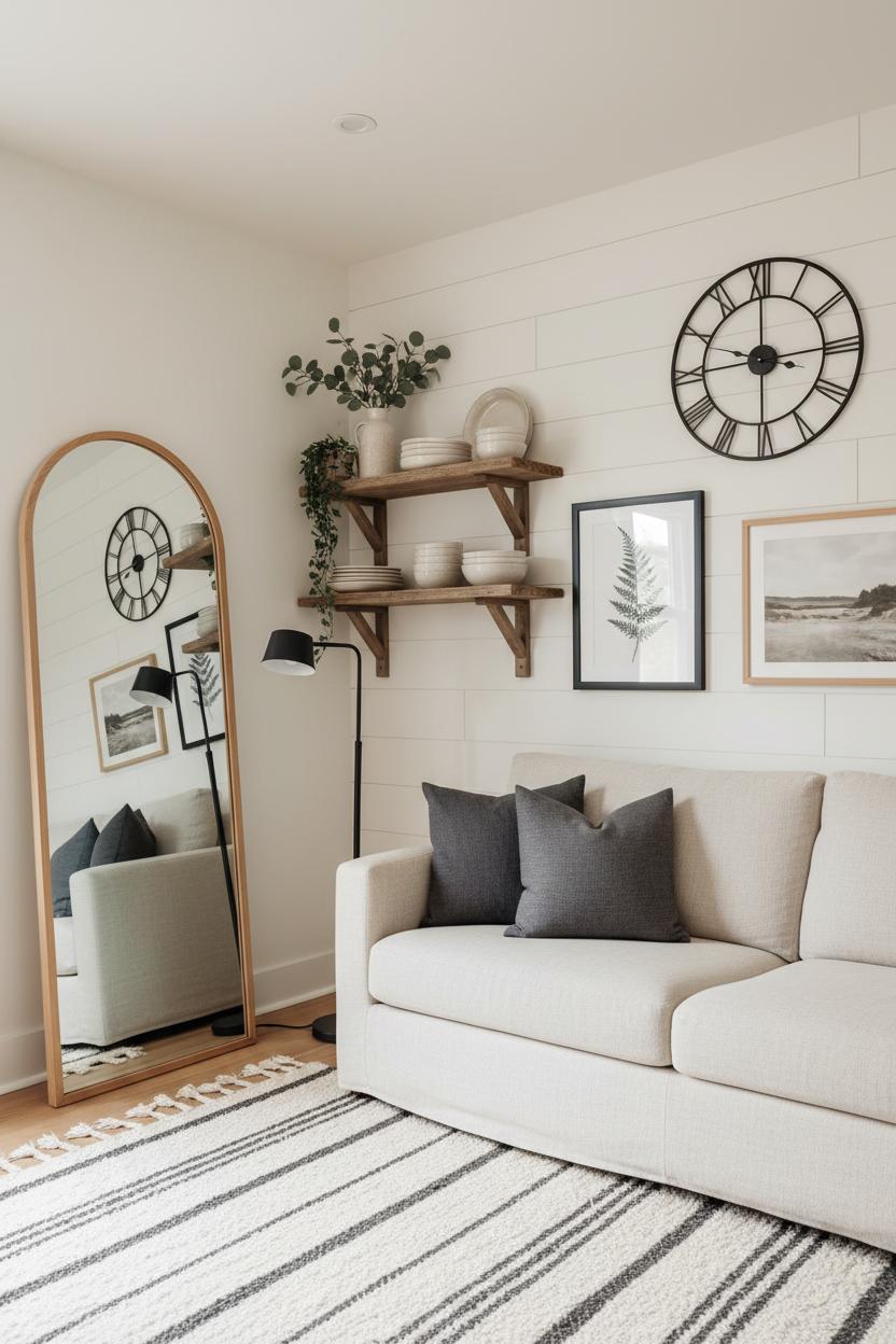 When you’re decorating an apartment or tiny cottage, modern farmhouse style shines because it mixes clean lines with cozy texture without overwhelming the room. Start by keeping the palette soft—think warm whites, oat-y beiges, and hints of charcoal—then layer in tactile elements to bring that country farmhouse decor charm. Peel-and-stick shiplap wallpaper is a renter-friendly way to get instant character on one accent wall, and a large mirror opposite a window will bounce light around like magic. Go vertical with reclaimed wood shelves to display stacks of stoneware, a trailing plant, and a ceramic pitcher vase filled with eucalyptus. For farmhouse wall decor, choose a few oversized pieces over many small ones: a vintage-inspired clock, botanicals in black frames, or a simple wood-framed landscape to ground your vignette without crowding it.