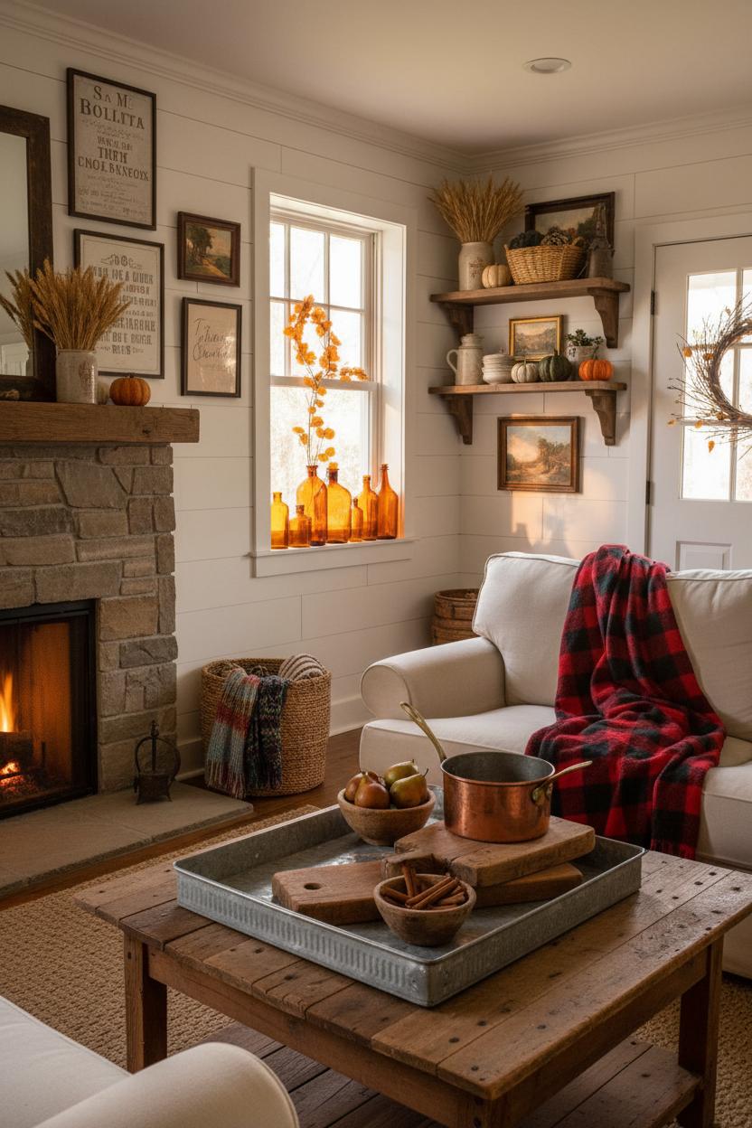 As leaves turn, lean into moody warmth and timeworn textures that make rustic home decor feel extra inviting. Think wheat bundles in crocks, plaid throws over the arm of a slipcovered chair, and amber glass bottles catching late-afternoon light. For easy farmhouse kitchen ideas, stack chunky cutting boards, prop a copper pot on the range, and swap citrus for pears in that same galvanized metal tray for an instant harvest centerpiece. Trade spring botanicals for vintage-inspired typography or landscape prints as farmhouse wall decor, and layer in dried gourds and mini pumpkins on your reclaimed wood shelves. At the door, a textured mat, a basket for scarves, and a simple twig wreath turn the farmhouse entryway into a cozy landing spot.