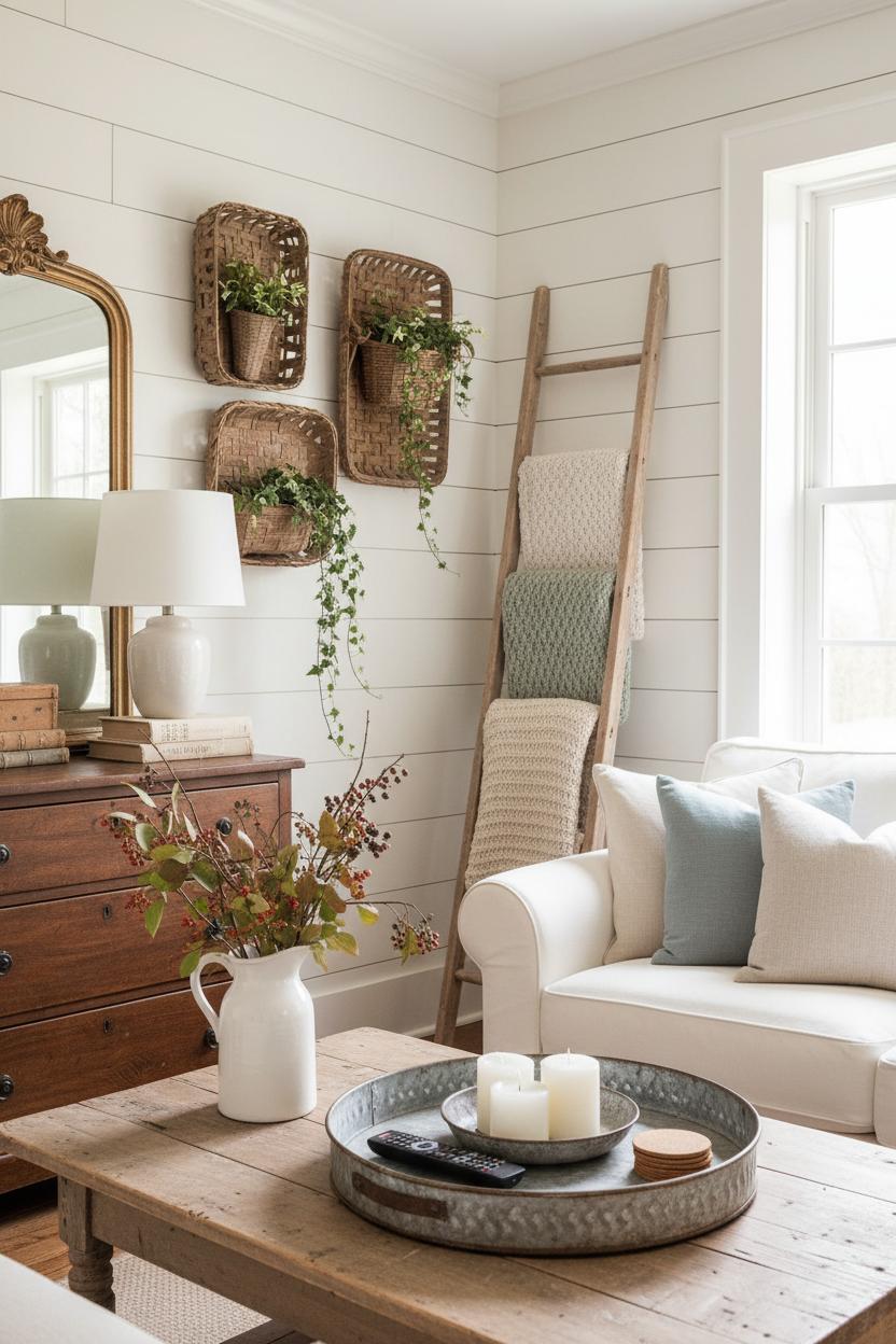 If you’re craving that collected-over-time look without splurging, start by “shopping” your house and the thrift store. Upcycled finds are the soul of country farmhouse decor: old baskets become wall planters, a ladder turns into a throw-blanket rack, and a galvanized metal tray instantly corrals remotes, candles, and coasters on the coffee table. Prop a vintage mirror over a dresser, cluster well-loved books under a lamp for height, and drop foraged branches into a ceramic pitcher vase for an effortless, seasonal centerpiece. Little swaps like these bring rustic home decor to life while telling your story. For quick texture on blank walls, peel-and-stick shiplap wallpaper offers that cozy, plank-look backdrop—perfect behind a console or bed—so your collected treasures and farmhouse wall decor pop without the cost or commitment of real wood.