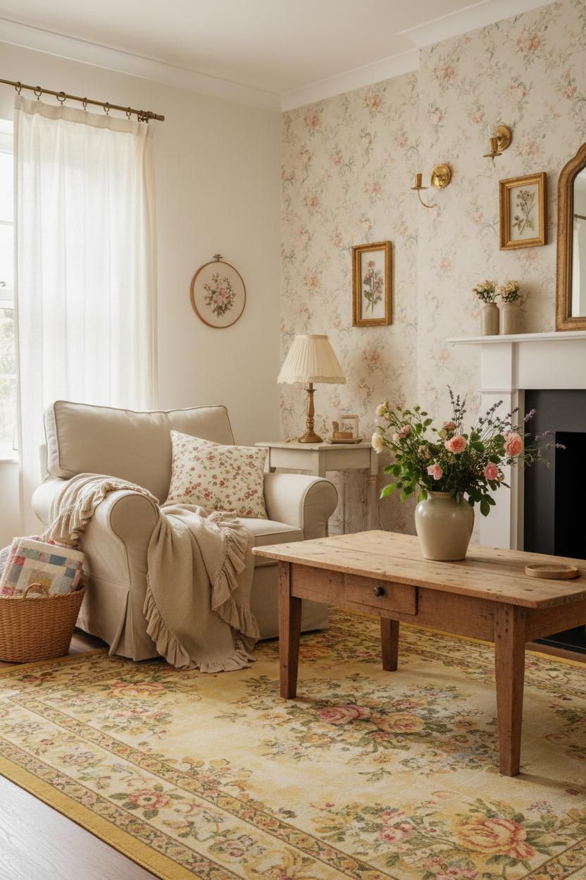 When you’re craving that gentler, storybook feeling, cottagecore style is your invitation to lean into softness and nostalgia. Think of it as the romantic side of the country home aesthetic: sun-warmed colors, tender textures, and details that feel lovingly gathered over time. Start with a mellow palette—creamy whites, buttercup, sage, and faded blush—then ground it with timeworn woods so your rustic living room keeps its sturdy backbone. Underfoot, a vintage style rug with a washed floral motif instantly whispers “cozy.” The warm glow of brass wall sconces layered with lamplight creates a candlelit hush in the evenings, perfect for reading or lingering conversations, and it’s amazing how quickly that small change shifts the entire mood of a cozy interior.