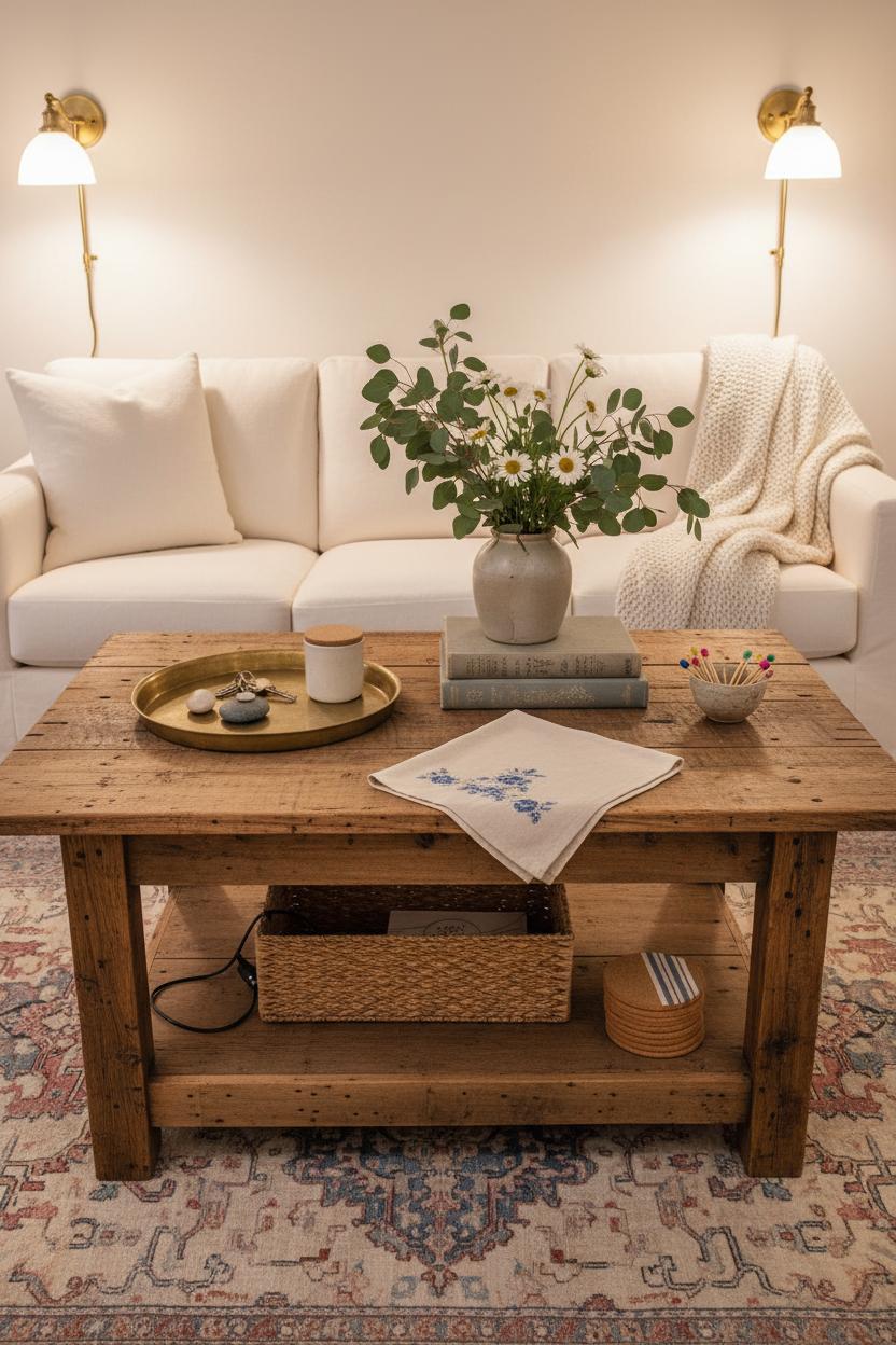 Play with height and texture to make it feel collected rather than cluttered. A petite lidded candle brings a gentle glow without competing with conversation, while a tiny bowl for matches or hair ties keeps practicality front and center. If your table has a raw finish, a petite runner or folded tea towel can protect high-traffic spots without hiding the gorgeous grain—think subtle stripes for farmhouse decor or a delicate floral for that cottagecore whisper. Frame the vignette with lighting: brass wall sconces on either side of the sofa bounce warmth across the table’s surface, highlighting the wood’s character in the evening. Underfoot, a vintage style rug grounds the arrangement and softens the edges, making room for bare toes and board games alike. Keep the styling flexible—swap the blooms for branches in autumn, citrus in a bowl come summer, or pinecones and a tiny wreath in winter—so the reclaimed wood coffee table evolves with the seasons of your home. The goal isn’t perfection; it’s a welcoming rhythm, where beauty meets everyday reach, and your rustic living room feels effortlessly gathered, thoughtfully useful, and always ready for one more mug of tea.