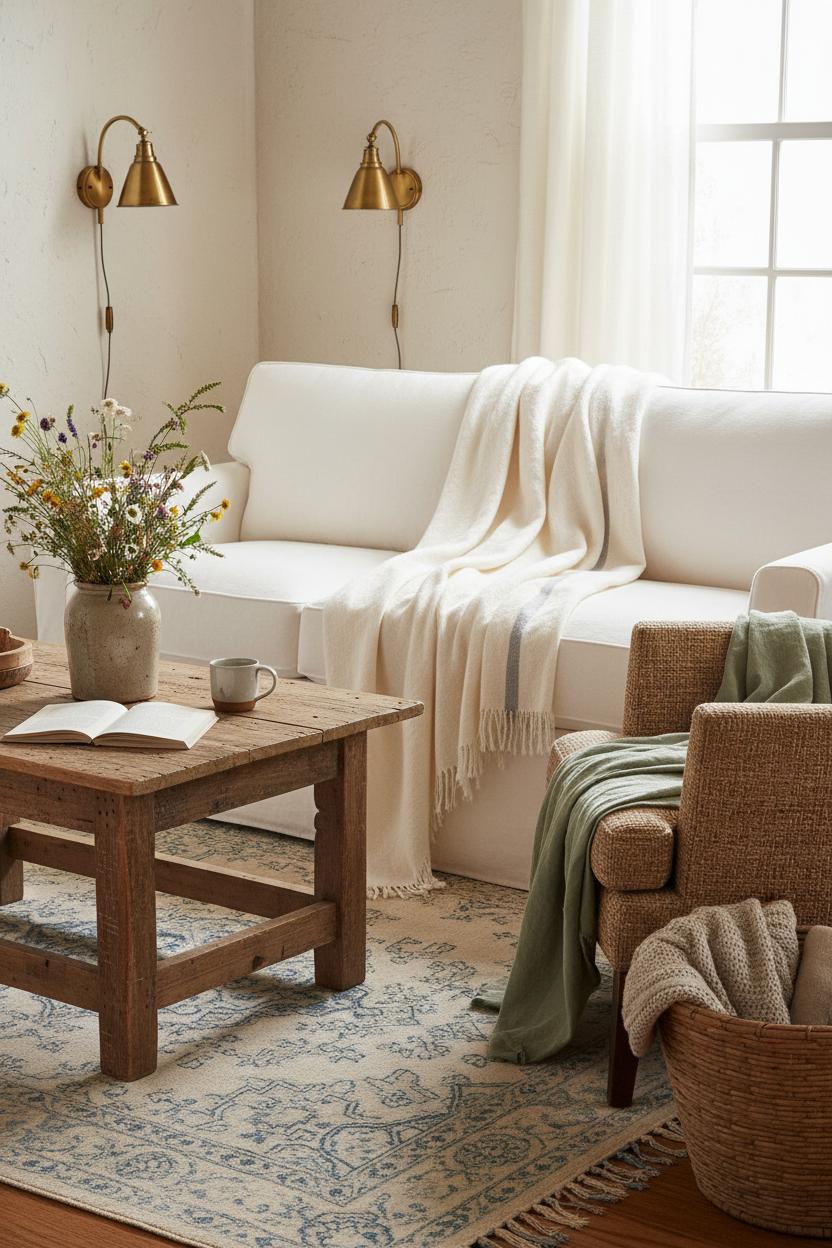Once the glow is right, weave in touchable textures that invite lingering. Drape a linen throw blanket over the sofa arm, pile on pillows in nubby knits, washed linen, and a hint of velvet, and ground the seating area with a vintage style rug that looks like it’s been loved for years. Mix subtle patterns—gingham, petite florals, or tonal stripes—for a whisper of cottagecore style without feeling themed. Add a sheepskin to a wooden chair, tuck a woven basket beside the hearth for extra throws, and let a well-worn quilt peek from a trunk or bench. The interplay of smooth ceramics, chunky textiles, and natural wood keeps the eye moving and the space feeling effortless. Style your reclaimed wood coffee table with stacked books, that stoneware vase, and a petite tray for matches or tea, and let the brass wall sconces glow above it all. With layers of light and touchable textiles, your farmhouse decor becomes more than pretty—it becomes a sanctuary-level cozy interior you’ll reach for again and again.