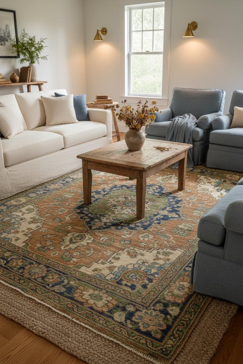 Let your rug be the quiet storyteller that ties together favorite accents: a reclaimed wood coffee table with a nicked-up edge, a soft linen throw blanket that echoes a thread of faded blue in the border, a simple stoneware vase filled with meadowy stems. When evening comes, the soft glow of brass wall sconces skims across the pattern, pulling out undertones you didn’t notice in daylight and adding a flicker of romance that suits both farmhouse decor and cottagecore style. If your space is open plan, a generously scaled rug also helps define the seating zone without blocking sightlines. Don’t forget the basement heroes—a quality rug pad for plushness and grip, seasonal rotation to even out sun-kissed fades, and quick blotting for spills to preserve that lovely patina. With a thoughtfully chosen vintage style rug underfoot, everything above it falls effortlessly into harmony, like the room has been evolving for years—collected, comfortable, and completely you.