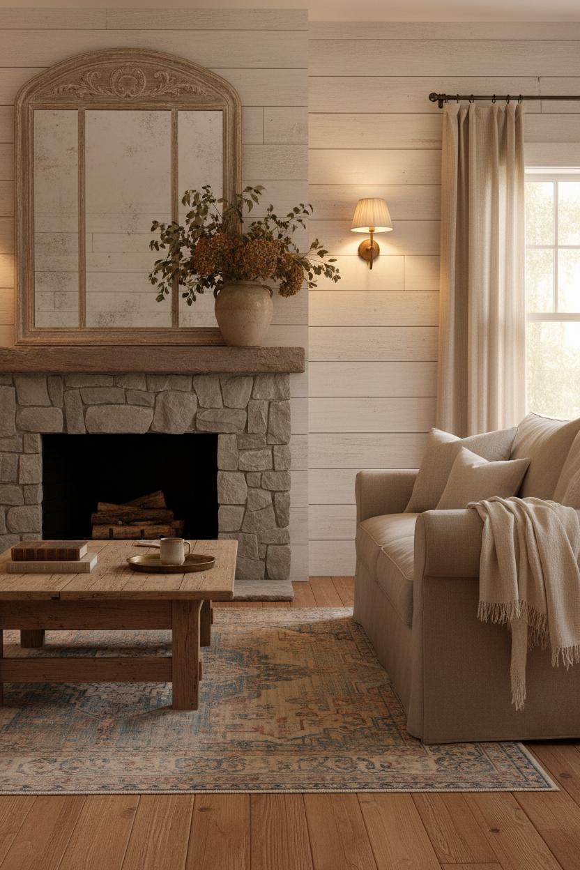 Now layer in the textiles that make a cozy interior sing. Start with a breezy base—linen slipcovers, cotton ticking pillows, and gauzy drapery that lets the light pour in. Then drape a generously sized linen throw blanket over the arm of the sofa, add a nubby wool pillow or two, and you’ve got texture-on-texture in the best way. A stoneware vase filled with foraged branches or garden roses brings an earthy, cottagecore style touch, the matte clay playing beautifully against polished wood and soft fabrics. For a hint of farmhouse decor, beadboard or a simple shiplap wall painted in a warm neutral adds gentle rhythm without stealing the spotlight. Keep lighting layered and low: the glow from those sconces, a petite table lamp on stacked books, and a candle or two on the coffee table set the mood for slow evenings. The secret is in the mix—plaid with floral, linen with knit, smooth with rough—so the room feels collected, not curated. Let pieces show their age, embrace the scuffs, and invite everyone to put their feet up. That’s the heart of a truly rustic living room—welcoming, imperfect, and beautifully relaxed.