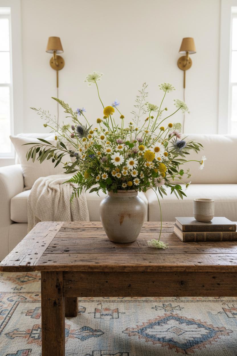 Once arranged, give your bouquet a worthy stage in your rustic living room: center it on a reclaimed wood coffee table where the grain and knots echo the wild texture of your stems, and let the whole vignette rest on a vintage style rug that grounds the scene with pattern and patina. Flank the area with the warm glow of brass wall sconces, drape a linen throw blanket across the arm of the sofa, and you’ve layered a cozy interior that whispers country home aesthetic without trying too hard. This is farmhouse decor at its breeziest—unfussy, soulful, and a little imperfect. The arrangement will shift as the days pass (change the water and snip the ends every couple of days), which only adds to the cottagecore style charm. A few stacked books or a candle nearby, and your stoneware vase becomes the easy, organic accent that ties the whole room together—proof that nature does the best styling of all.