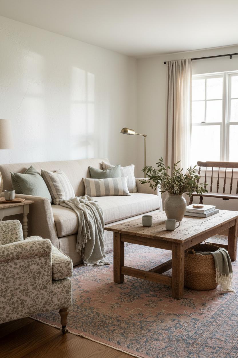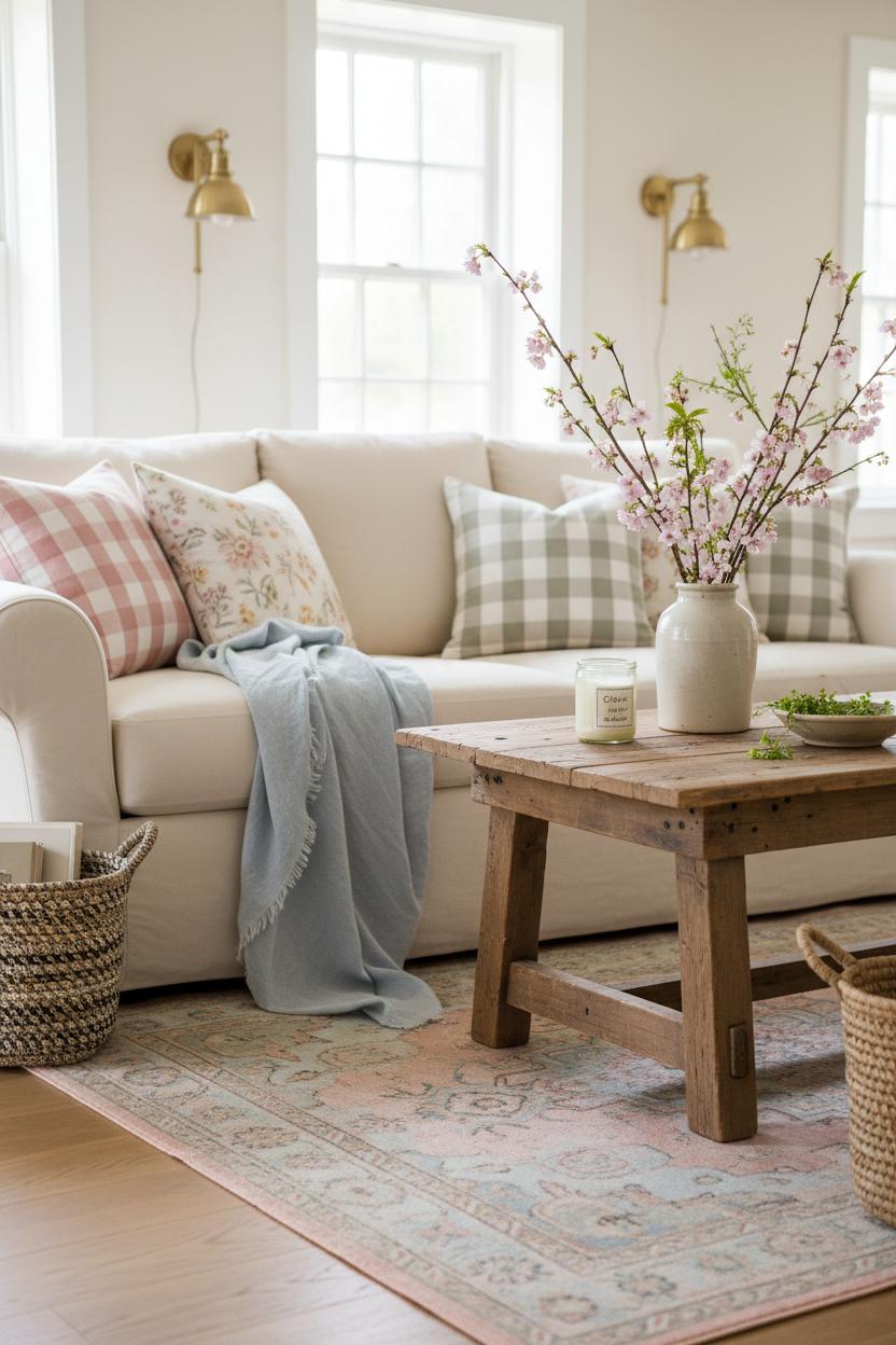 Think of your living room like a capsule wardrobe: a few timeless pieces you love, refreshed with seasonal layers. Keep your anchor elements—like a reclaimed wood coffee table, a neutral sofa, and softly gleaming brass wall sconces—steady, then rotate the textiles and accents to keep that cozy interior feeling just right month after month. In spring, invite in light and movement with a linen throw blanket draped at the sofa’s edge, airy cotton pillow covers in gingham or soft florals, and a stoneware vase filled with blossoming branches or wild greenery. A faded vintage style rug in blush, sage, or sky tones feels right at home with a country home aesthetic and leans into cottagecore style without feeling fussy. Come summer, go even breezier: swap heavy curtains for sheers, tuck away wool and velvet, and let woven baskets and seagrass trays corral books and remotes while adding texture. Citrus-scented candles and a bowl of garden clippings keep it fresh and unfussy.