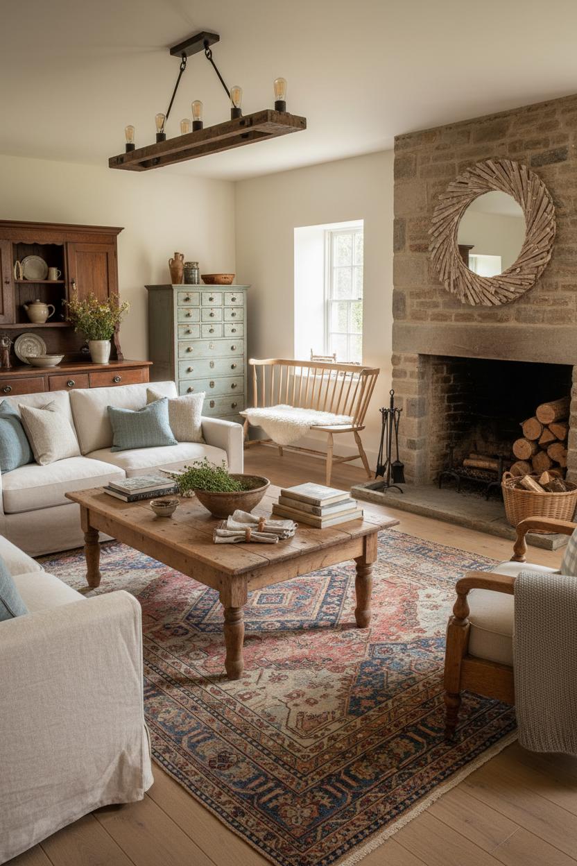 Balance that earned ruggedness with softness and glow. A linen slipcover sofa keeps the look light and cloudlike next to a timeworn sideboard, while a farmhouse coffee table grounds the seating area without competing for attention. Underfoot, a vintage rug layers in pattern and hushes echoes, making the whole space feel cocooned. Overhead, a wooden beam chandelier echoes the tones of your heirlooms and casts the kind of flattering light that makes wood gleam. If you’re lucky enough to have a hearth, lean into stone fireplace decor—simple iron tools, stacked birch, a driftwood mirror—to bridge rough textures with refined lines. Style surfaces with humble, useful things: crockery filled with thyme, a stack of linen napkins, a basket of kindling, a cluster of well-thumbed books. It’s farmhouse style with a cottagecore home heartbeat—gentle, practical, and deeply pretty.