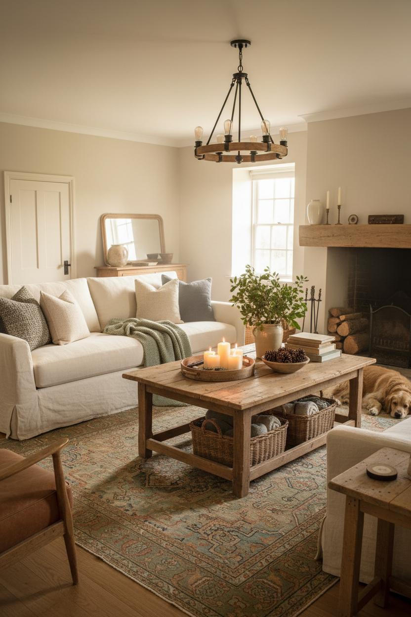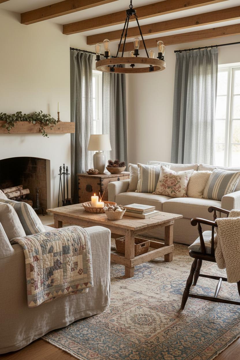 From there, it’s all about warmth and texture. A vintage rug underfoot adds pattern and patina, grounding the palette in earthy rusts, faded blues, or mossy greens that whisper rustic decor without shouting. Overhead, a wooden beam chandelier throws a honeyed glow that flatters every surface, while stone fireplace decor—think stacked logs, aged iron tools, and a simple mantel arrangement—adds that fireside heartbeat of a cottagecore home. Keep your styling easy and unfussy: a tray on the coffee table for candles and remotes, a crock or pitcher of wild branches, a few dog-eared novels, maybe a bowl of pinecones gathered on a walk. Mix textures with intention: the crisp weave of linen against the rough grain of wood, a glossy ceramic vase beside a hand-forged candle snuffer, a bit of brass to catch the light. Let the palette drift toward oat, cream, and clay with hints of charcoal and sage, so everything feels calm but never flat. With a linen slipcover sofa to sink into and a farmhouse coffee table at the center of conversation, your living room becomes the heart of home—an invitation to linger, nap, and make slow, simple memories that only deepen with time.