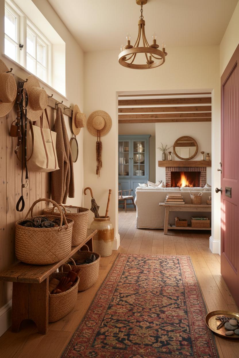 The sweetest welcomes start right at the door, and in a country house interior, an entryway can whisper everything you love about home in a single glance. Think a shaker-style line of peg rails stretching across a sunlit wall, ready to catch straw hats, market totes, and that favorite cardigan you reach for on chilly mornings. Beneath, a family of wicker baskets corrals the daily tumble—one for mail, one for dog leads, one for the inevitable pile of gloves—instantly turning clutter into charm. Layer a vintage rug runner underfoot, the kind with faded florals or timeworn reds and indigos, so every step into the house feels soft and storied. Overhead, a wooden beam chandelier casts a warm, honeyed glow that skims the walls and kisses the patina of vintage wood furniture—a narrow bench or antique console that offers a spot to perch while tugging off boots. It’s a simple formula, but the effect is everything: rustic decor that feels curated, not contrived; a farmhouse style welcome that invites you to breathe out.