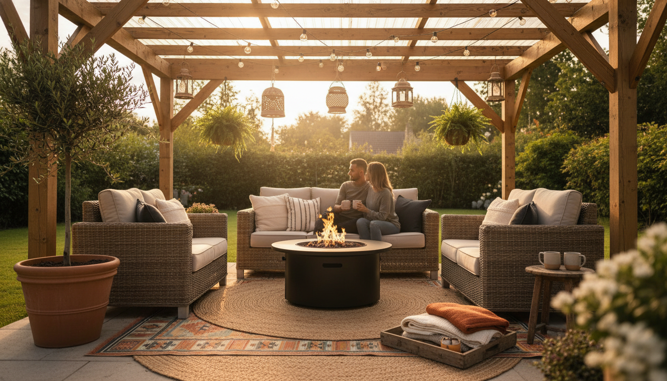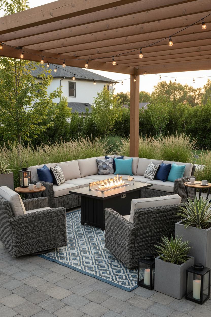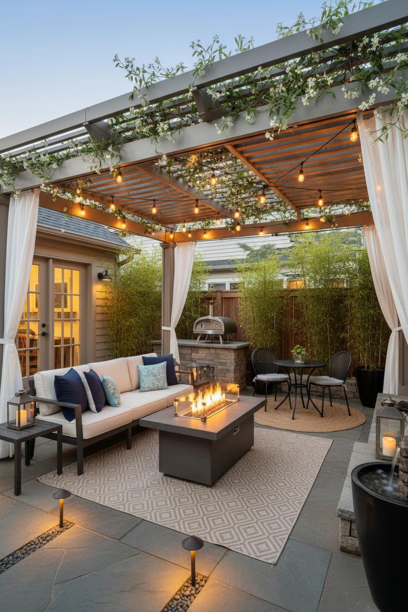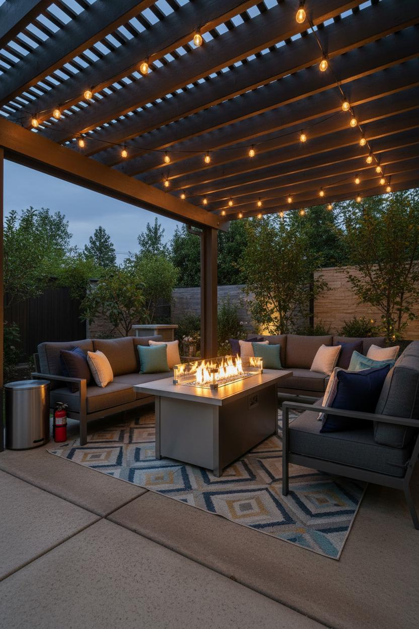 Next, carve out zones so your space works like an indoor floor plan. Anchor an outdoor living room with a cushy patio furniture set on a weatherproof outdoor rug, then pile on waterproof throw pillows for that sink-in moment. A compact propane fire table doubles as a coffee table and season-stretcher, inviting s’mores nights well past summer. Nearby, set a petite dining nook with a bistro table, and tuck the grill or pizza oven where smoke won’t drift through seating. Use tall planters, a console table, or a low bench to subtly define each zone without building walls. Overhead, string outdoor string lights from the pergola or along the patio roof line to create that golden, Pinterest-y glow that makes even weekday dinners feel special.