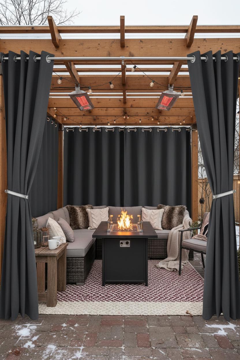 Think of your outdoor living room like a closet you curate with the seasons—same beloved bones, fresh layers on top. As temps dip, lean into warmth and enclosure: clip up breezy curtains for windbreaks and privacy, then add a second layer of heavier outdoor panels with weighted hems so they won’t billow in a gust. A propane fire table becomes your instant hearth, flickering beneath the patio roof while radiant heaters mounted overhead take the edge off cold air. Pile on waterproof throw pillows in cozy textures and swap in a chunkier weatherproof outdoor rug to insulate underfoot. If your space skews open, consider a simple pergola design and run café-style drapery on stainless rods; draw them closed on blustery days and the whole area feels like a snug garden tent. It’s the kind of practical magic that turns good covered patio ideas into true four-season comfort without sacrificing that dreamy, twinkle-lit vibe.