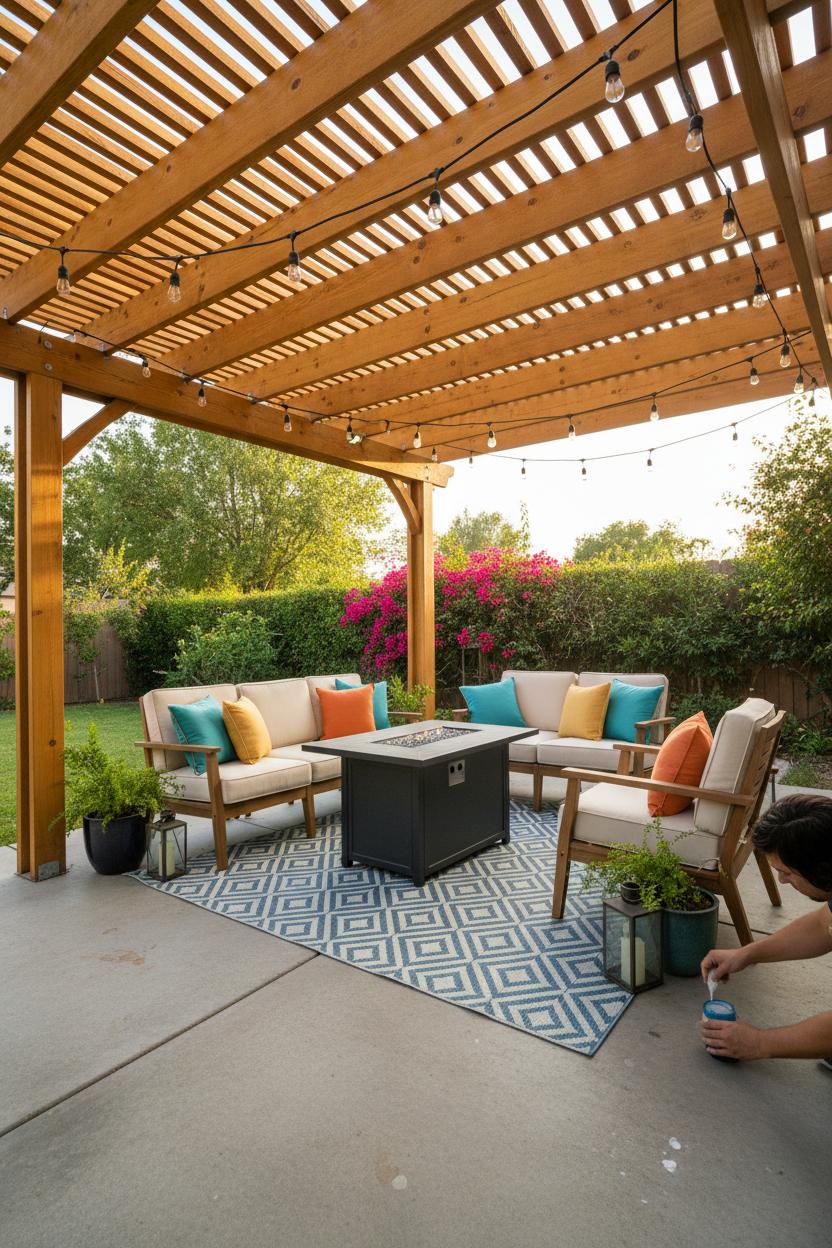 Ready to level up? Try a weekend-warrior upgrade that blends polish with practicality. Swap the slats on your pergola design for clear polycarbonate panels to create a light-loving patio roof that sheds rain while keeping everything bright. Add privacy with lattice or horizontal slat screens, tuck in a slim storage bench, and roll out a larger weatherproof outdoor rug to define zones. A propane fire table turns chilly evenings cozy in seconds, while a sturdier patio furniture set and a mix of waterproof throw pillows deliver that indoor-meets-outdoor comfort. This is the sweet spot where your covered patio ideas become an inviting, three-season outdoor living room without calling in a full crew.