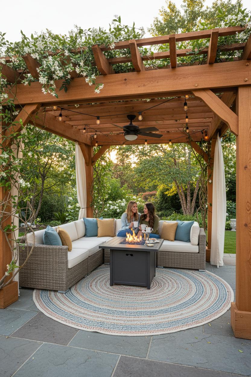 Style is where your pergola design sets the tone for the entire backyard makeover. Warm cedar or redwood reads classic and coastal, while a matte-black aluminum frame feels clean and modern against greenery. Stain it dark for drama or whitewash for a sun-faded, beachy feel. Layer in the comforts: a curated patio furniture set to anchor the space, a weatherproof outdoor rug to define the conversation zone, and waterproof throw pillows that pull your palette together and stand up to surprise showers. For chilly evenings, a propane fire table becomes the instant gathering point—cozy heat, ambient light, and s’mores on standby. The key is to mix textures—wood grain, woven wicker, smooth metal—with soft textiles for a look that’s both elevated and inviting.