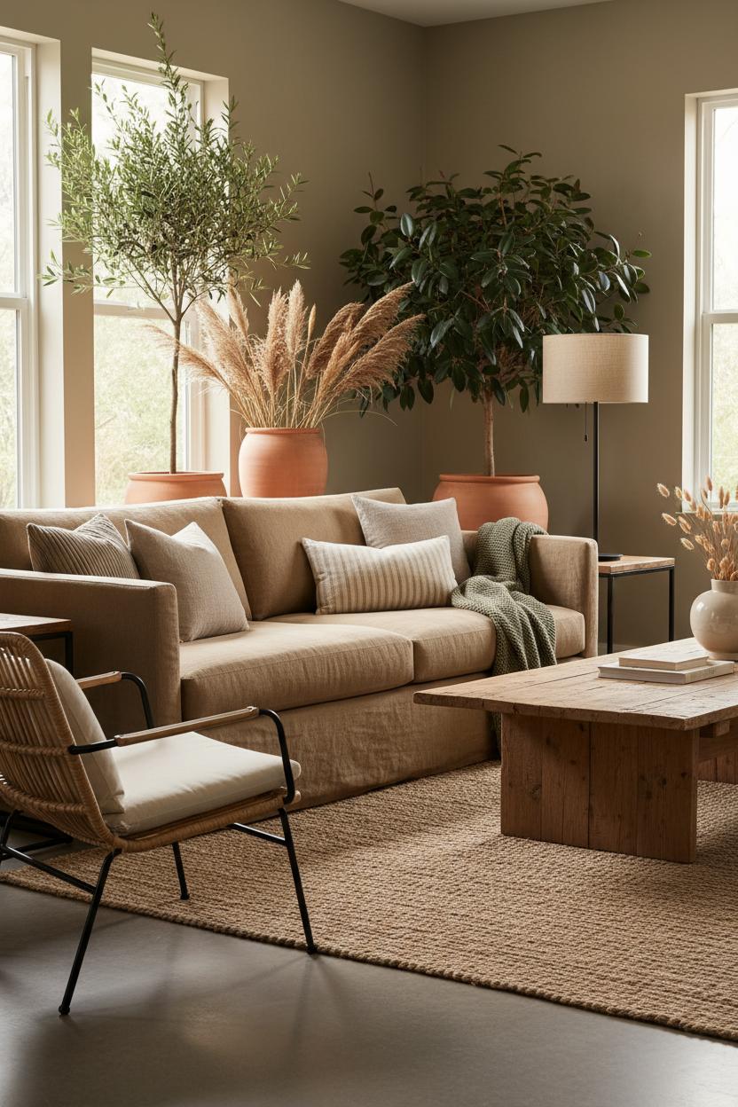 When picking a silhouette, consider a deep, low-slung profile with a bench cushion for that lounge-all-day vibe, or a slipcovered option for breezy, coastal ease. Performance linen is a smart compromise if you want the look with extra durability; removable covers make life with pets and kids less stressful. Layer in your jute rug style underfoot to add grit and grounding, then bring in a wooden coffee table with a chunky, timeworn grain to echo the organic textures. A rattan accent chair keeps the visual weight light, while black iron or oil-rubbed bronze details add just enough contrast. Tuck a pair of terracotta planters beside the sofa—olive branches, a rubber plant, or dried grasses—to pull in earthy, sunbaked tones and a hint of sculptural height.