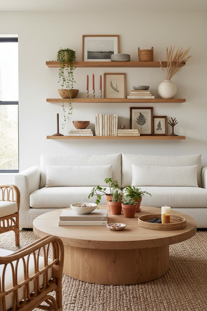 Open shelving is your chance to stretch that story vertically and pull the whole scene into focus. Think airy, floating shelves in honeyed oak or moody walnut, styled with a gentle rhythm: stacked stoneware, a framed landscape, a small basket tucked beside books turned spine-out for that neutral home decor look. Keep heights varied, repeat tones three times across the shelves, and leave pockets of quiet so the eye can rest. A trailing plant softens edges; a vintage wood bowl nods back to the coffee table; a clay taper holder echoes the terracotta planters below. If your jute rug style leans coastal, add bleached driftwood; for a cozier vibe, weave in darker wood picture frames and an iron bookend to ground the warmth. Across from the shelving, the linen sofa and a rattan accent chair keep the palette balanced and layered, while the wooden coffee table anchors conversation. In the end, it’s the easy mix—plants, pottery, books, baskets—that makes organic modern feel lived-in and lovely, with natural wood accents tying every texture together.