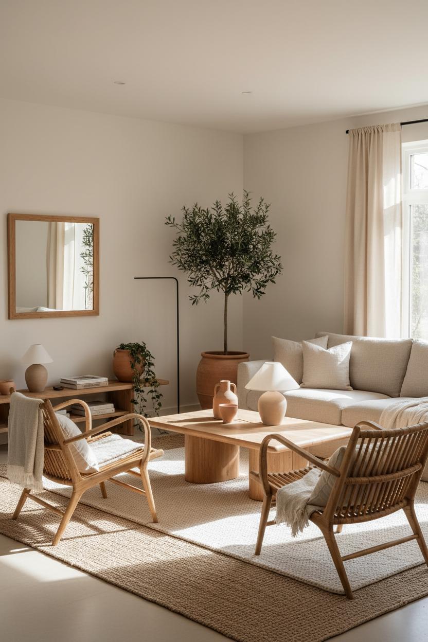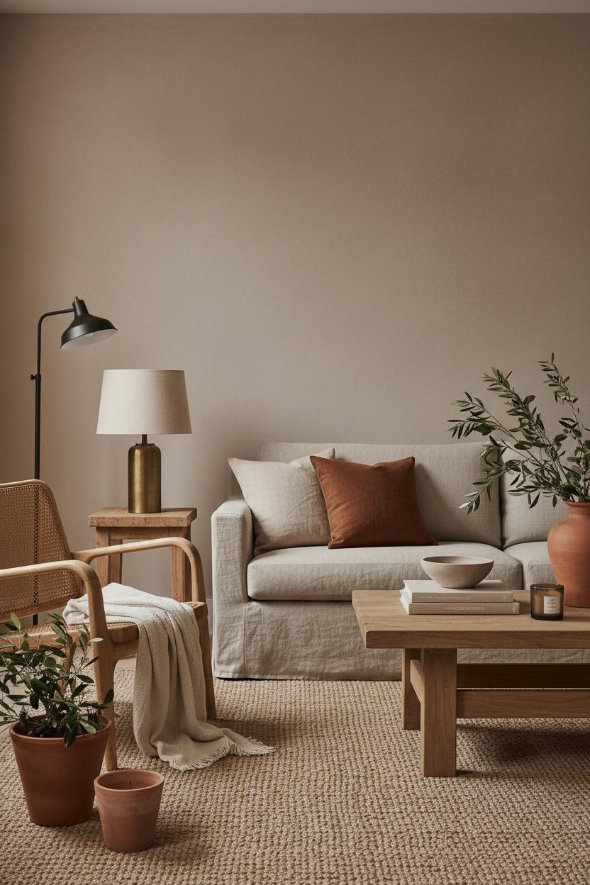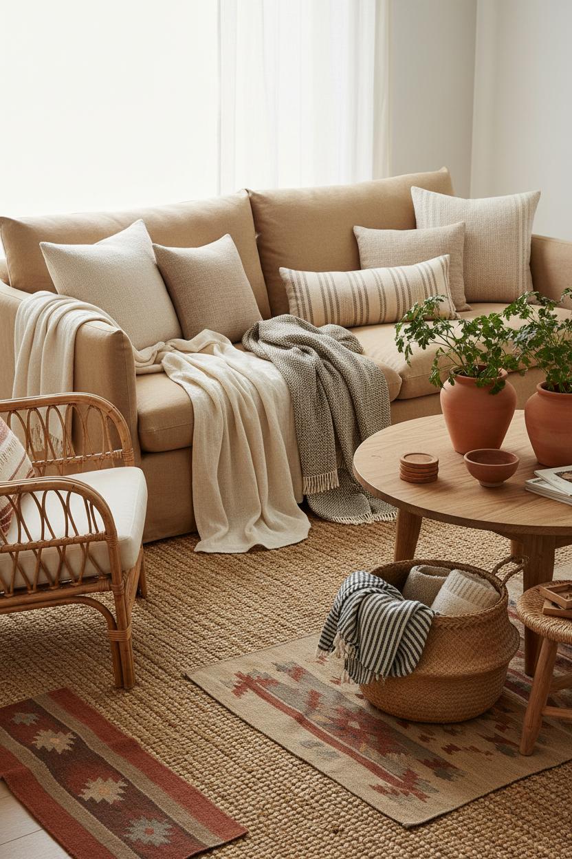 Underfoot, anchor the space with a jute area rug that brings that classic jute rug style and gentle golden hue, grounding all the softness with tactile strength. Pull up a rattan accent chair for an airy counterpoint and let terracotta planters supply that sunbaked note that ties the room back to earth. A wooden coffee table—especially one with visible grain and rounded corners—adds natural wood accents that harmonize with baskets, trays, and small stools scattered nearby. Style your throws with intention: one folded cleanly, one tossed with a little fringe spill; vary cushion sizes and fills so the sofa looks inviting rather than staged. If your textiles feel too quiet, layer a slim patterned wool runner over the jute or tuck a striped throw into a basket for a hint of contrast. The result is a tactile rhythm that feels calm, elevated, and wonderfully touchable—proof that the best neutral rooms aren’t about color at all, but about how materials whisper to each other.