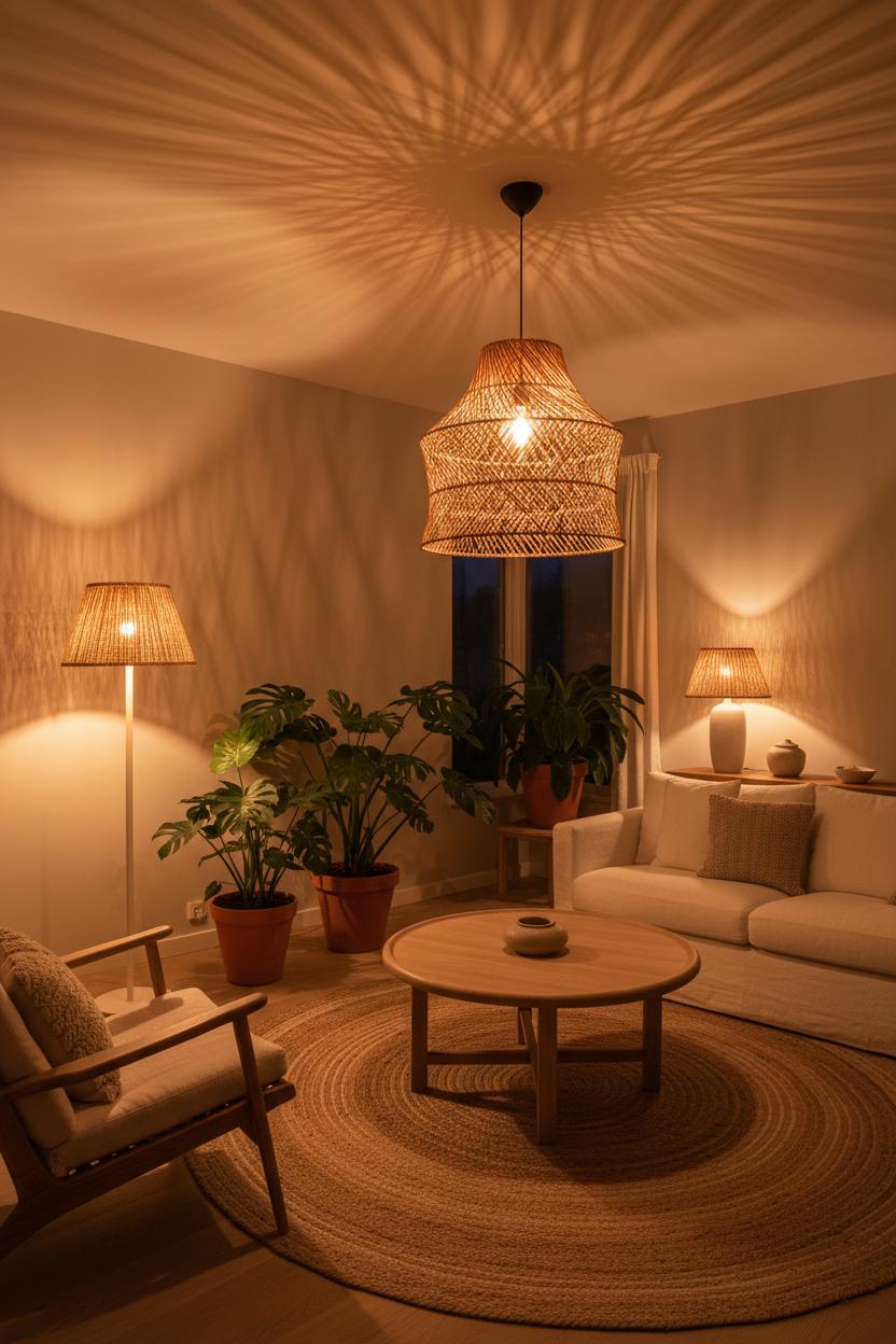 To make the glow feel intentional, repeat the natural materials that already live in the room. If you’ve got a linen sofa and a jute area rug, echo that fiber with a rattan accent chair and a woven floor lamp tucked beside it for reading. A wooden coffee table anchors the scene with natural wood accents, and a pair of terracotta planters near the window picks up the warm tones from your lamp light, making greenery look extra lush at night. Keep the silhouettes simple so the textures do the talking: clean drum shapes, slender lamp bases, and unfussy pendants that don’t fight the view. For a small space, try two petite pendants flanking the sofa instead of one big one; in a larger room, layer a flush-mount near the entry with a statement pendant in the center and a sculptural table lamp on the console to guide the eye. Lean into jute rug style by choosing shades in sandy, oat, or honey hues, and let the light skim across grainy wood, nubby upholstery, and woven baskets. The result is a quietly glowing nest—grounded, tactile, and perfectly at home in an organic modern palette that feels calm by day and cocooned by night.