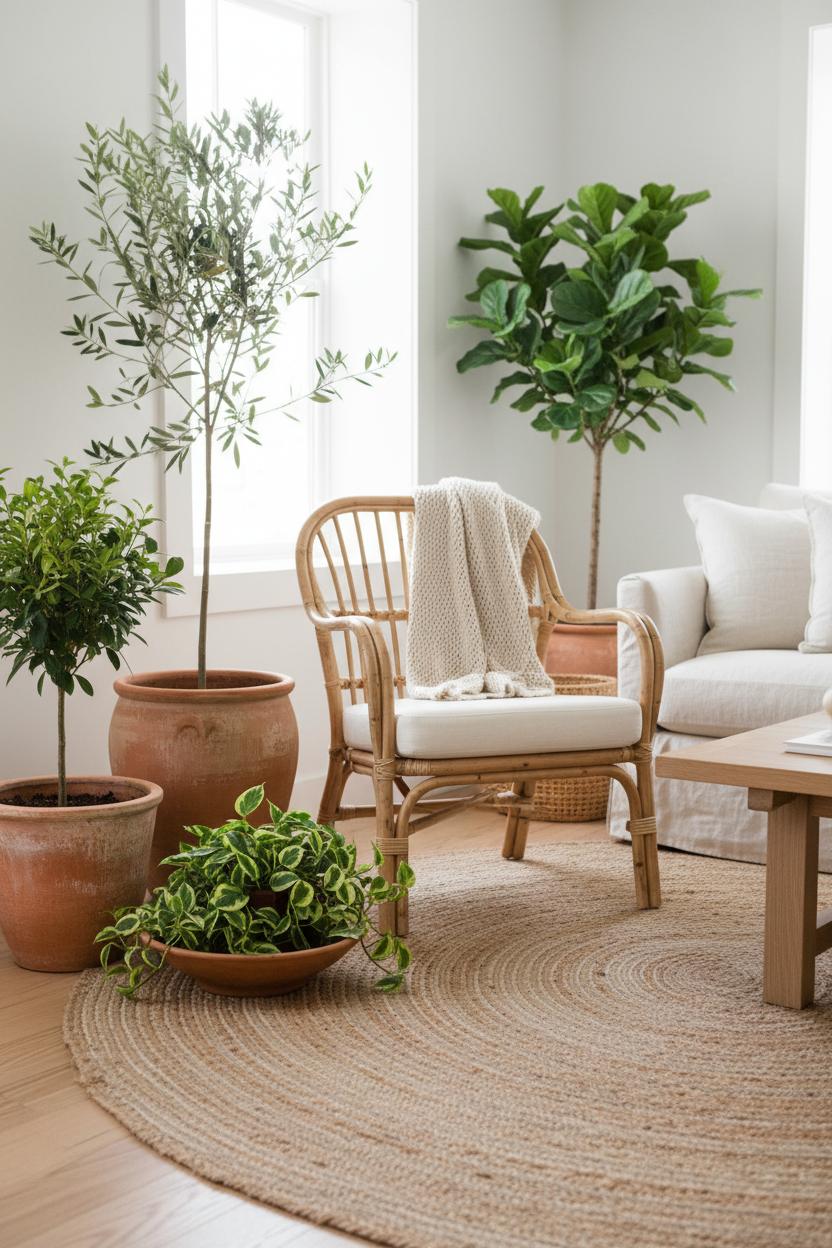 Terracotta planters are the perfect companion: their earthy color grounds the palette and whispers of travel-worn pottery without overwhelming the room. Mix heights—one medium planter with a graceful olive tree, a smaller one for a trailing pothos—so the eye travels upward and around. Group them near the chair to create an intentional moment, then anchor the whole setup with a relaxed jute rug style underfoot or a larger jute area rug if you have the space. The warm clay tones tie in beautifully with rattan and the gentle slub of linen, rounding out a neutral home decor scheme that still feels rich with texture. Small, wallet-friendly pieces; big, cozy payoff.