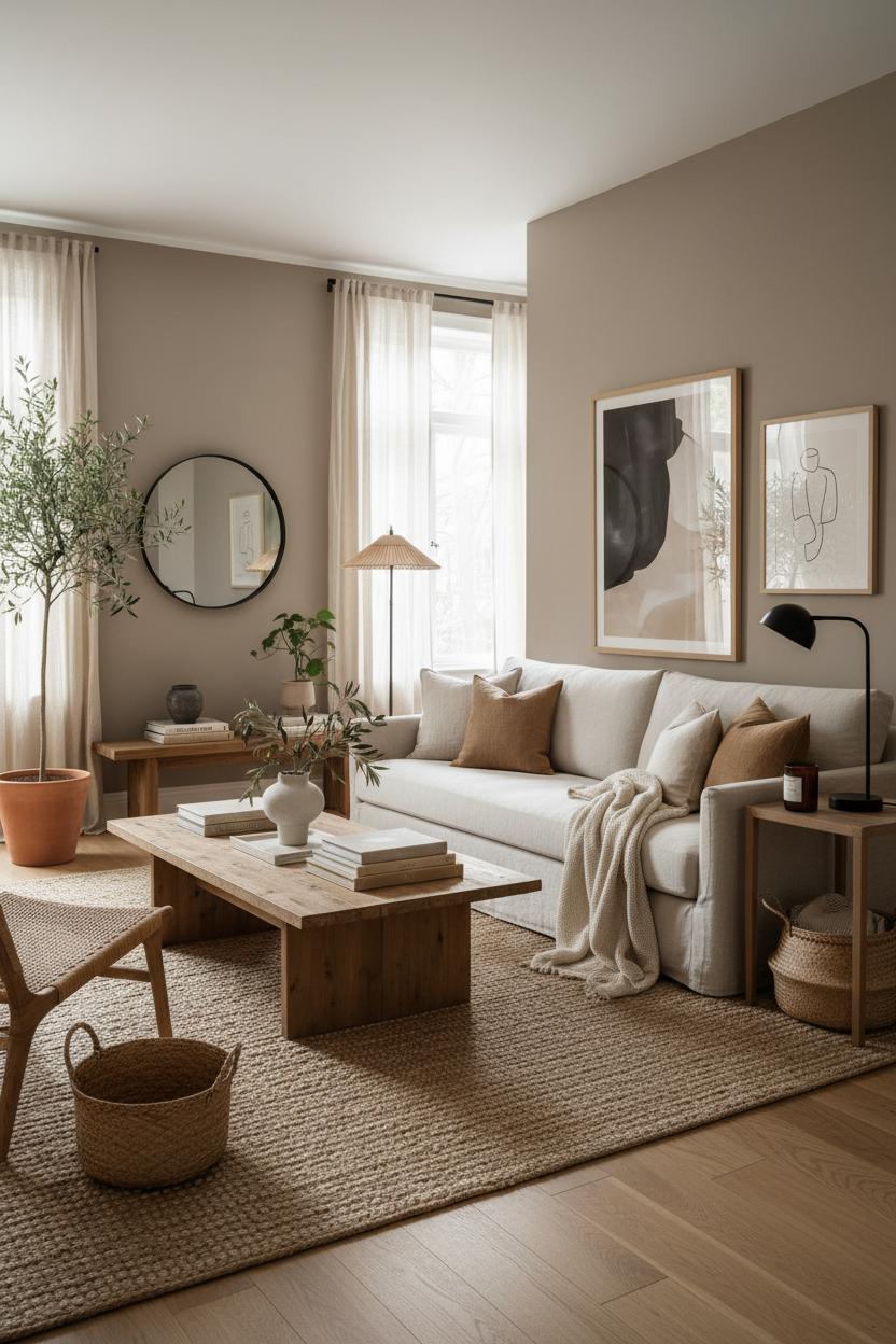Style the coffee table like a mini landscape: a matte ceramic vase with branches, a travertine or wood tray, and a stack of well-loved design books. On the walls, choose art that feels grounded—abstract washes, quiet landscapes, or line drawings—so the room remains calm and cohesive. A few baskets for throws, a subtle vetiver or cedar candle, and you have a space that invites slow mornings and cozy evenings. The goal is a room that breathes—layers of tactile comfort, thoughtful natural wood accents, and a balanced mix of modern forms and earthy soul—so your neutral home decor feels warm, welcoming, and wonderfully lived-in.