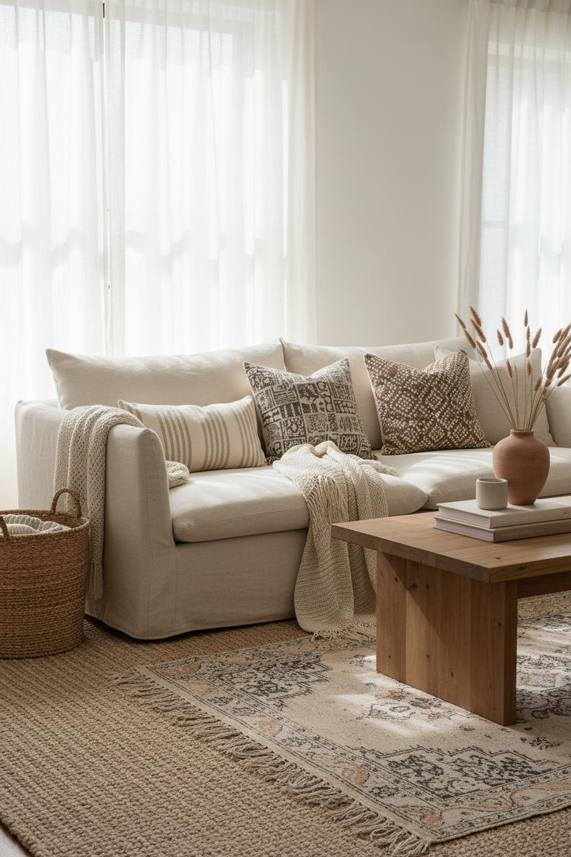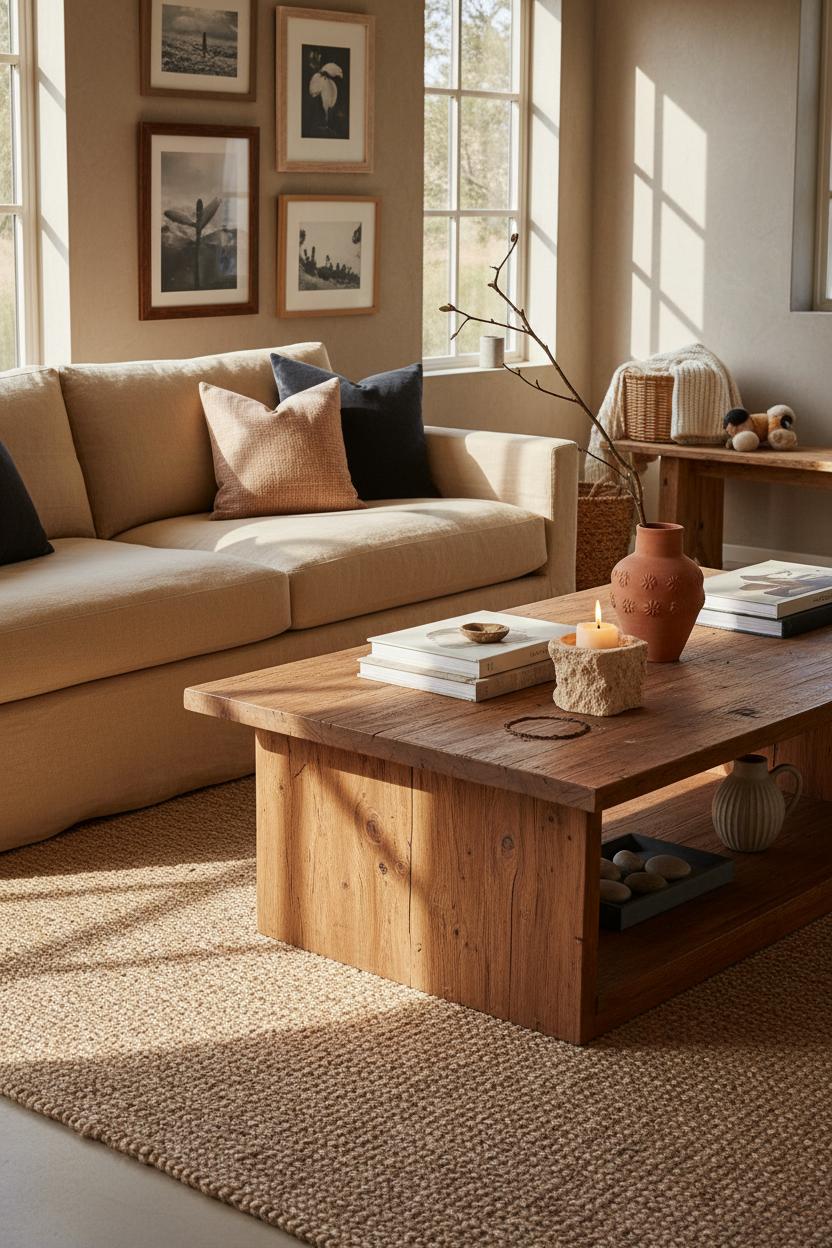 Balance those textiles with tactile accents that ground the space. A solid wood coffee table brings beautiful grain and weight, a terracotta vase on top adds earthy color and matte texture, and a stack of linen-covered books or a ceramic candle holder rounds everything out. The interplay of wood, clay, fiber, and fabric makes the room feel effortless yet thoughtful—exactly what we love about natural decor. Before committing, gather swatches and live with them for a day: drape a throw over the linen sofa, layer a pillow on the jute rug, set your vase nearby. If it feels calm, cozy, and a little sun-washed, you’ve found your perfect mix of neutrals, pattern, and organic textures.