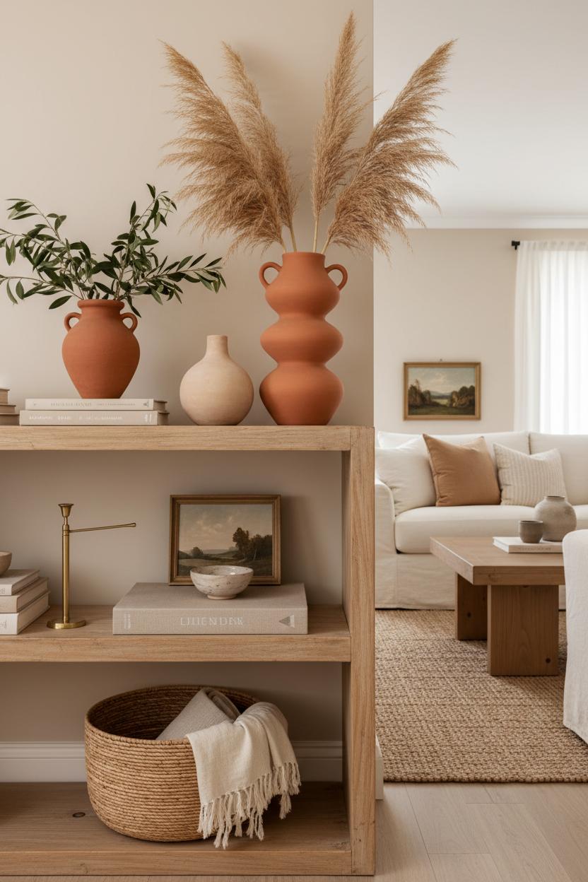 Think of your shelves as the jewelry of an earthy living room—simple pieces that make everything else feel finished—and let a terracotta vase be the sculptural anchor that sets the tone. I love starting with one generous, curved vase in that sun-baked clay color, then building around it with layers of natural decor that feel collected, not cluttered. Play with height and silhouette: a tall terracotta vase with a few airy dried stems, a squat clay vessel with a soft matte finish, and a smooth stone or hand-carved wood object to ground the scene. Stack a couple of neutral coffee table books horizontally, let a petite framed landscape lean casually behind, and leave breathing room so the shapes read as art. The warmth of terracotta pulls out the organic textures on your shelves and makes even the most neutral home feel inviting. Keep the palette soft—sands, almond, oat, and umber—so the look stays boho modern without shouting, and repeat materials like clay, linen, and rattan to create quiet cohesion.