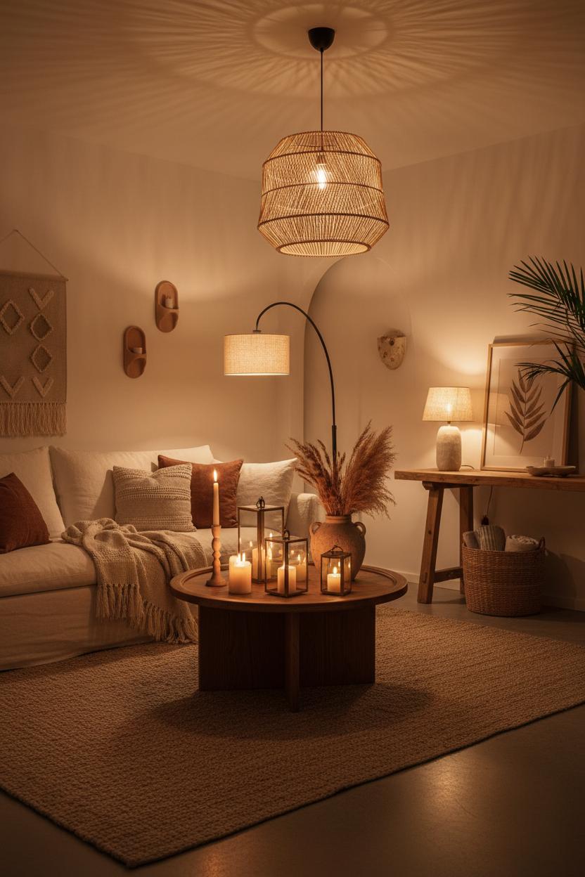Lighting is the quiet magic that makes an earthy living room feel instantly grounded and welcoming. Think of it as the warm heartbeat of your natural decor: soft pools of light, gentle shadows, and organic silhouettes that echo the textures in your space. Start by swapping harsh, cool bulbs for warm white (around 2700K–3000K) to bathe your neutral home in a honeyed glow that flatters everything from a linen sofa to a jute rug. Layer your lighting the way you layer throws—ambient first, then task and accent. A rattan pendant or woven drum shade casts beautiful, dappled patterns that mirror the organic textures in wood and stone; paper lanterns or linen shades diffuse light like a soft fog at golden hour. For reading, a curved floor lamp beside the sofa feels sculptural without stealing attention, while small wall sconces in clay or matte metal bring a touch of boho modern charm with a gentle, cocooning wash of light.