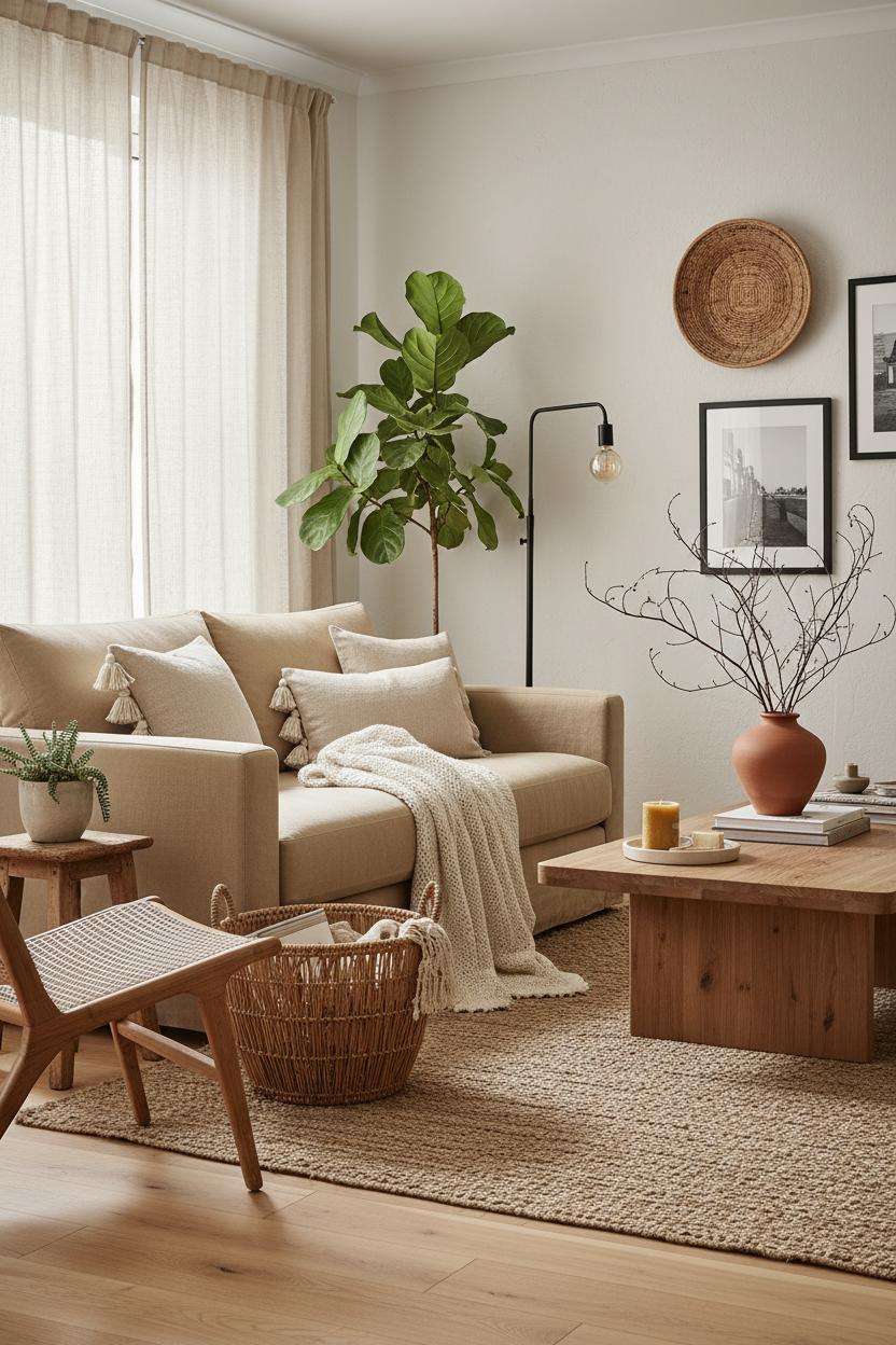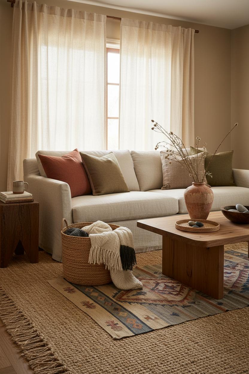 Anchor the seating with a solid wood coffee table—something with visible grain and a soft, rounded edge—then style it with pieces that look like they came straight from the earth. A terracotta vase with branches brings height and a bit of wildness; a stack of linen-bound books adds weight and soul. Tuck a rattan basket beside the sofa for throws and magazines, letting its honeyed tone echo the woven shades or a cane accent chair. If you love contrast, sprinkle in black iron or oil-rubbed bronze through a slim floor lamp or picture frames; it sharpens the cozy without breaking the organic flow. Soft, gauzy curtains filter light like morning mist, and a couple of warm, low-glow lamps create pools of evening calm.