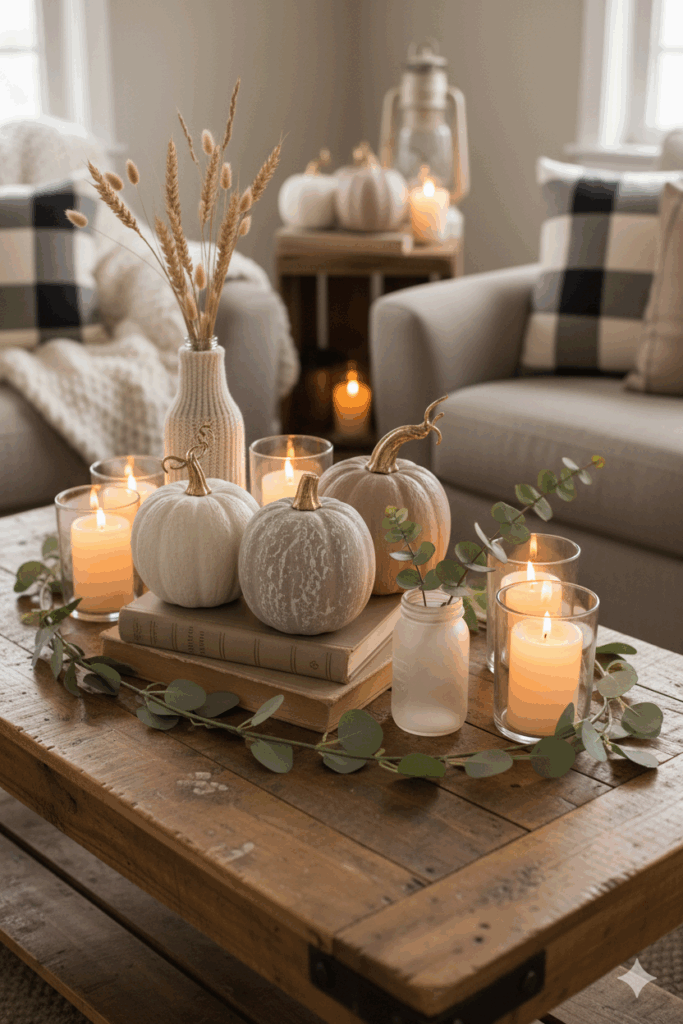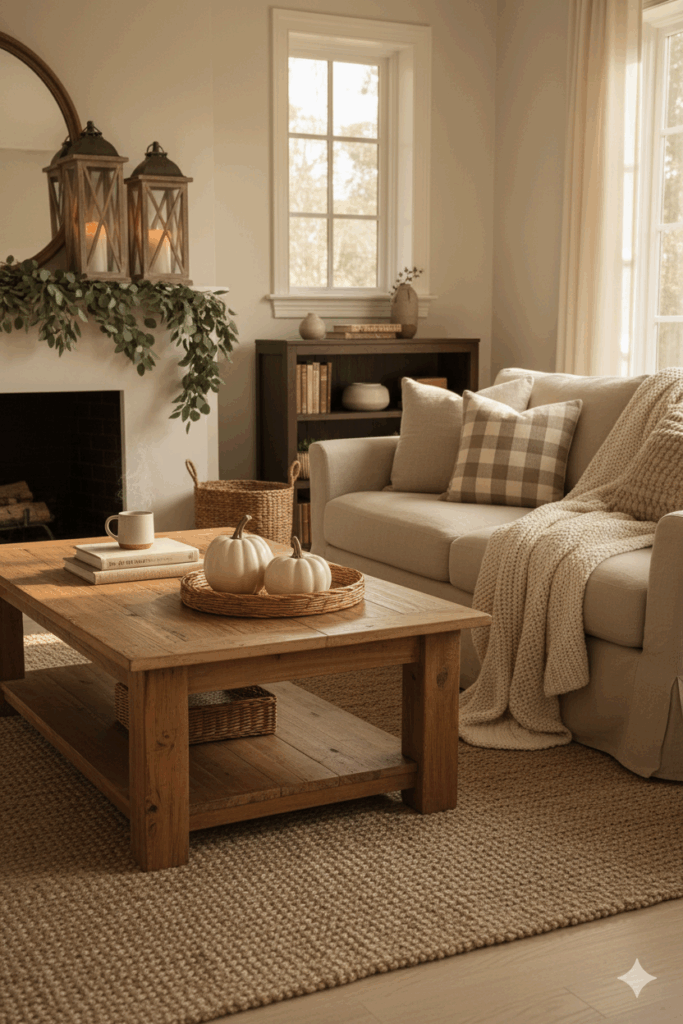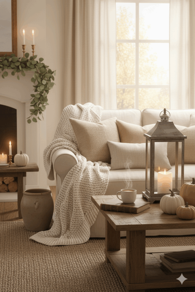 Cozy living room styled for fall with a neutral sofa, chunky knit throw, plaid pillows, eucalyptus garland, ceramic pumpkins on a wood coffee table, brass candleholders glowing, and warm beige and terracotta accents.