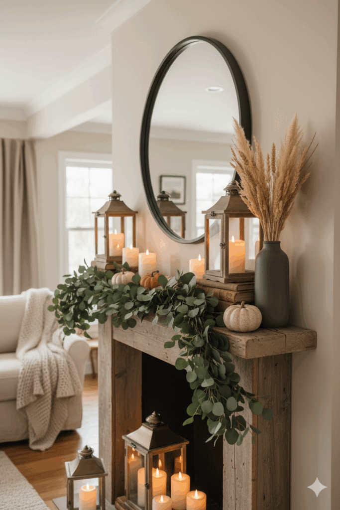 To bring in soft, seasonal accents, sprinkle in ceramic pumpkins—matte cream, speckled clay, or a subtle terracotta—so the colors whisper autumn rather than shout it. I like to keep the palette neutral and layered: eucalyptus greens, oat and camel tones, and a touch of charcoal. Let the asymmetry do the work by clustering candles on one side and balancing with a single statement vase on the other, filled with dried wheat or fluffy pampas. It’s elevated autumn home decor with minimal effort, and the flameless candles make it pet- and kid-friendly. If your mantel is narrow, keep the eucalyptus garland tucked close and let one delicate strand trail; if it’s deep, lean into volume with two garlands and extra candle groupings.
