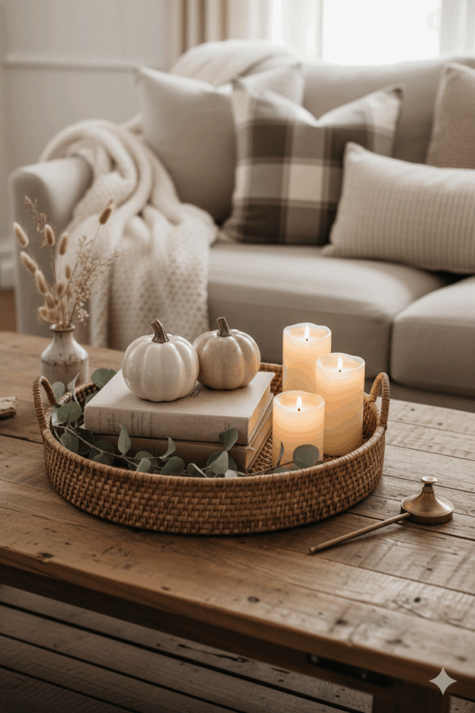 Balance the table with texture around it. A knit throw blanket draped over the sofa arm and a mix of fall pillow covers in nubby linens and quiet plaids pull the palette outward so the table doesn’t have to do all the talking. Keep the colors warm and hushed—creams, oat, caramel, sage—so the scene feels collected and calm. A tiny bud vase with foraged stems (think dried grasses or a clipped branch) adds height without blocking sight lines. If your space leans modern, swap the tray for a low marble board; if you’re more rustic farmhouse, a vintage breadboard is perfect. And here’s a styling tip: vary your shapes—rounded pumpkins against rectangular books, a cylindrical candle beside a loose garland—to keep the eye moving. Echo the same formula on a console or even outdoors for porch styling: a stack of weathered books, a cluster of ceramic pumpkins, and flameless candles tucked into lanterns. It’s simple, unfussy, and totally welcoming—exactly the kind of living room moment that makes you want to sink in and stay awhile.