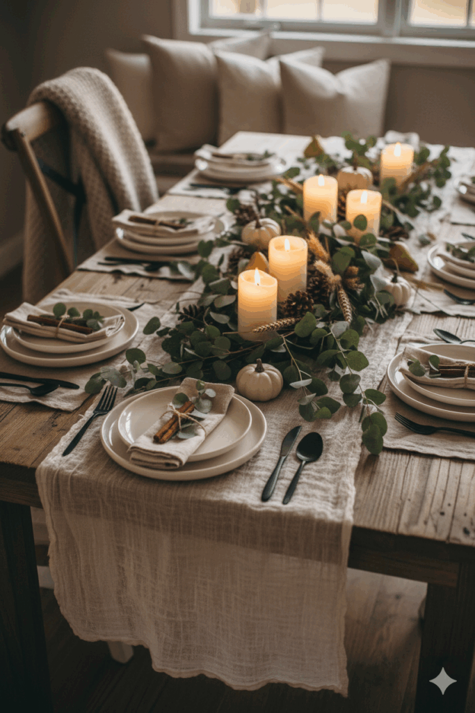 Rustic Farmhouse Tablescape: Linen Runners, Eucalyptus Garland, and LED Pillar Candles