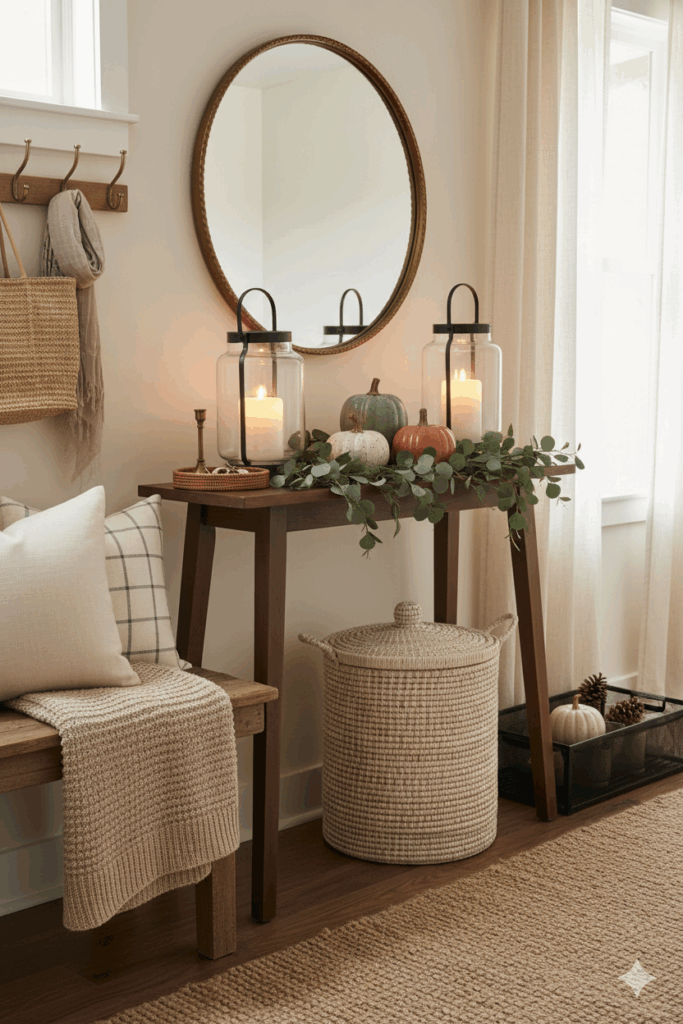 Make it welcoming and practical with pieces you’ll reach for daily. A storage bench piled with fall pillow covers instantly reads seasonal while still being easy to swap later. Slide a lidded basket underneath for hats and scarves, and roll a knit throw blanket over the bench arm so guests can snag it as they transition to the cozy living room. Hooks in aged brass or matte black keep totes and coats tidy, and a boot tray styled with a petite ceramic pumpkin or a cluster of pinecones adds charm to the “functional” zone. If your entry flows straight from the stoop, think porch styling that seamlessly transitions indoors: layer a coir mat over a larger outdoor rug, hang a wheat-and-eucalyptus wreath, and echo the greenery inside with that same eucalyptus garland on your console so the whole space feels thoughtfully connected.