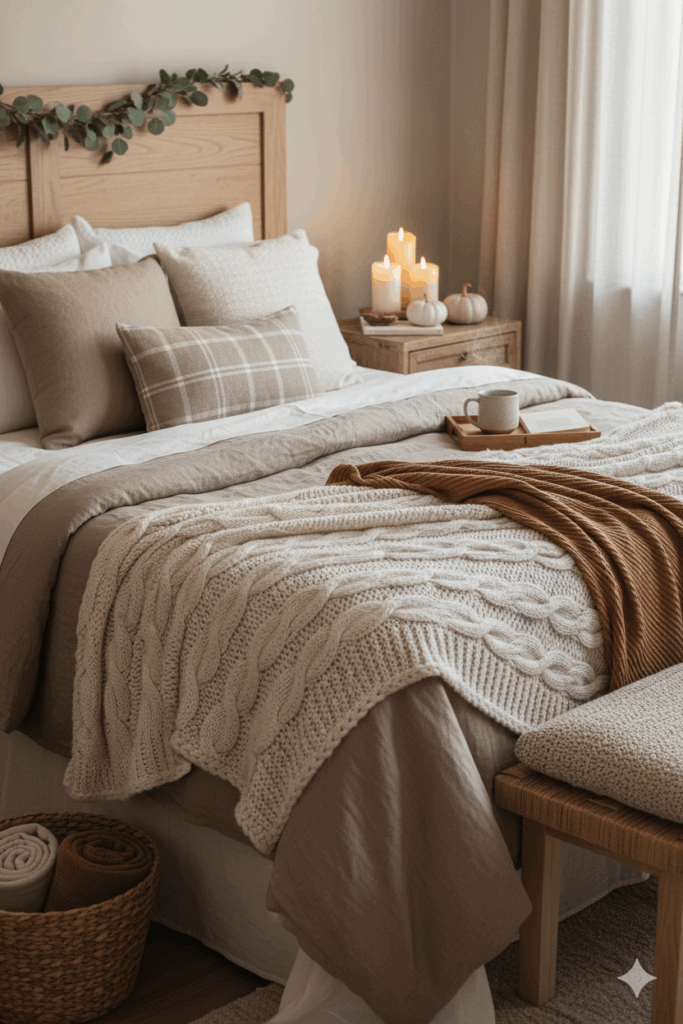 When the temperatures dip, I love carving out a little sanctuary in the bedroom—a cozy nook layered with touchable textures and warm neutrals that whisper “slow down.” Start with a neutral base on the bed: creamy linen sheets, a soft taupe duvet, and then go all-in on layers with a chunky knit throw blanket draped casually at the foot. Add a second lighter knit or a ribbed cotton throw folded across the corner for that effortless, collected look. A couple of fall pillow covers in oatmeal, caramel, or muted plaid instantly deepen the palette without overwhelming it. I like to tuck a small bench or basket at the end of the bed to corral extra blankets for chilly mornings, keeping the vibe calm and clutter-free, just like the best autumn home decor should feel.