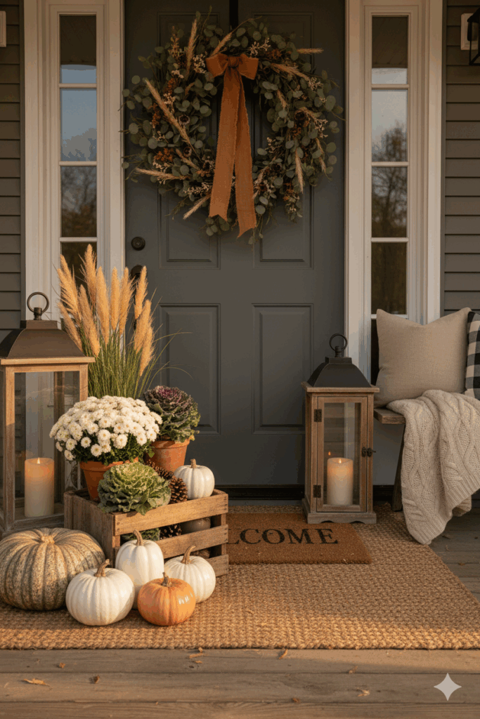 Finally, bring in the cozy. If you have a bench or swing, drape a chunky knit throw blanket over the arm and swap in fall pillow covers in linen, herringbone, or faux leather to tie your exterior to your cozy living room palette. Keep it tonal—creams, camel, and charcoal—so the whole space reads warm and calm, then add just a whisper of copper or brass in a door knocker or lantern handle for shine. A layered doormat (jute under, coir on top) finishes the scene and welcomes muddy boots. Don’t be afraid to edit as the season rolls on; porch styling is a living vignette. Refresh mums, rotate in new ceramic pumpkins, and let that eucalyptus garland dry in place. By the time the air turns crisp, your entry will glow—inviting neighbors, happy mail carriers, and every golden-hour photo op.