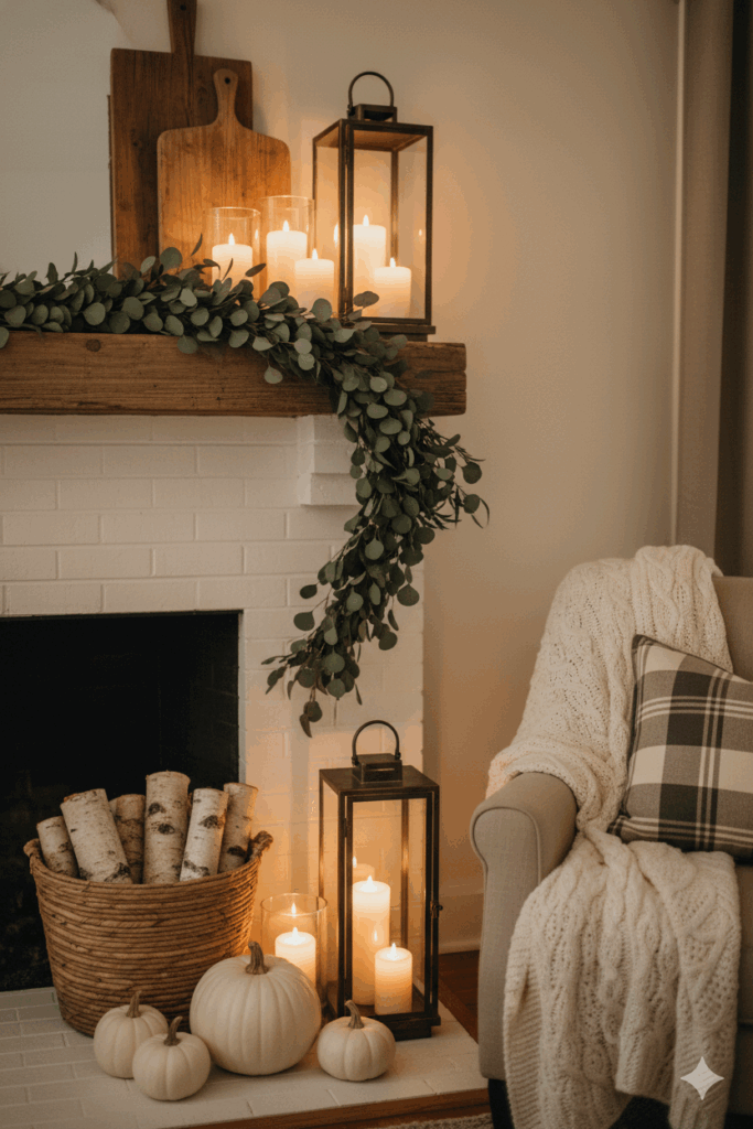 To make your whole home feel cohesive, echo these rustic farmhouse touches beyond the firebox. If your mantel wears eucalyptus garland, repeat a strand on a mirror in the entry or around a porch lantern for effortless porch styling. Keep the same candlelight rhythm across spaces so your eye travels from the hearth outward, following the glow. A few mindful switches—plush textiles, natural greenery, sculptural pumpkins, and the gentle shimmer of candlelight—turn a simple fireplace into the coziest gathering spot and tie your autumn home decor together beautifully.
