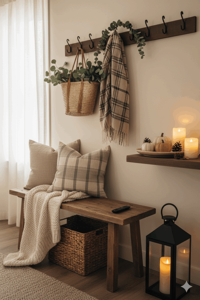 Small-Space Autumn Home Decor: Slim Benches, Wall Hooks, and LED Pillar Candles