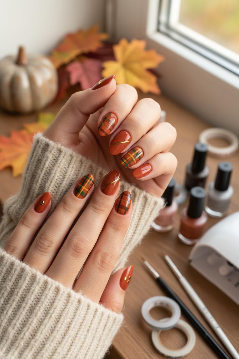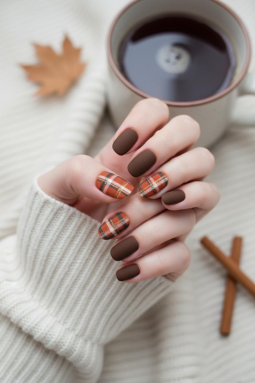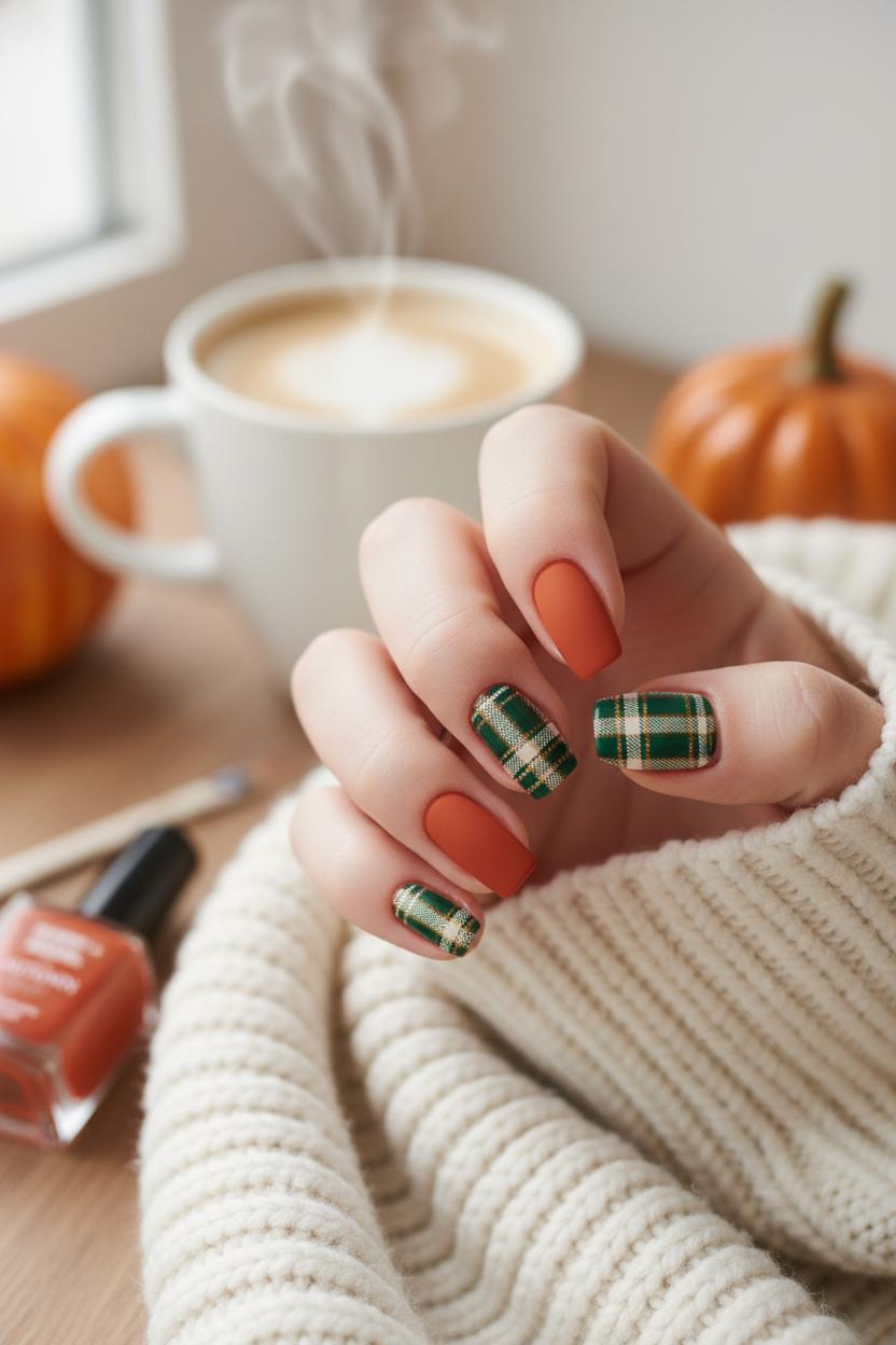 If you love keeping your nails short and practical, round and almond shapes are perfect canvases for cozy nail ideas that still feel polished. Think burnt orange latte tones with a soft-focus finish, a touch of plaid at the tips, and tiny details that make your autumn nails feel like your favorite sweater. On short rounds, try a negative-space micro-French in cinnamon or terracotta with a single plaid accent on the ring finger—use striping tape nail art or fine nail art brushes to keep those lines crisp. For short almonds, angle your French tip so it swoops diagonally across the nail, then layer a delicate plaid overlay in cream and espresso to echo classic plaid nails without overwhelming the shape. A matte manicure ties it all together; a velvety matte top coat instantly makes burnt orange look richer and more “fall.”