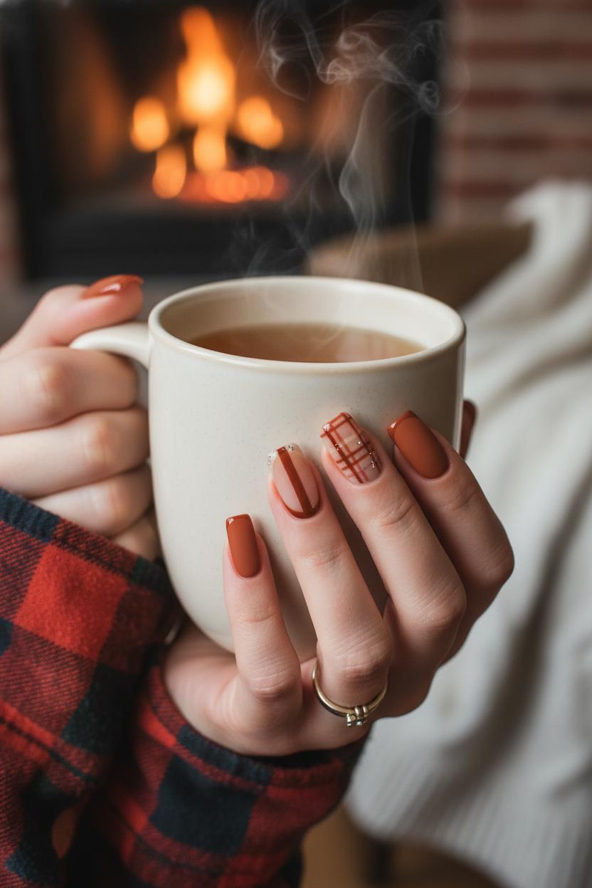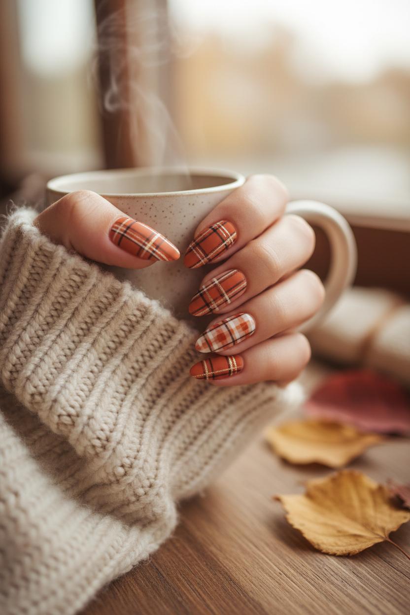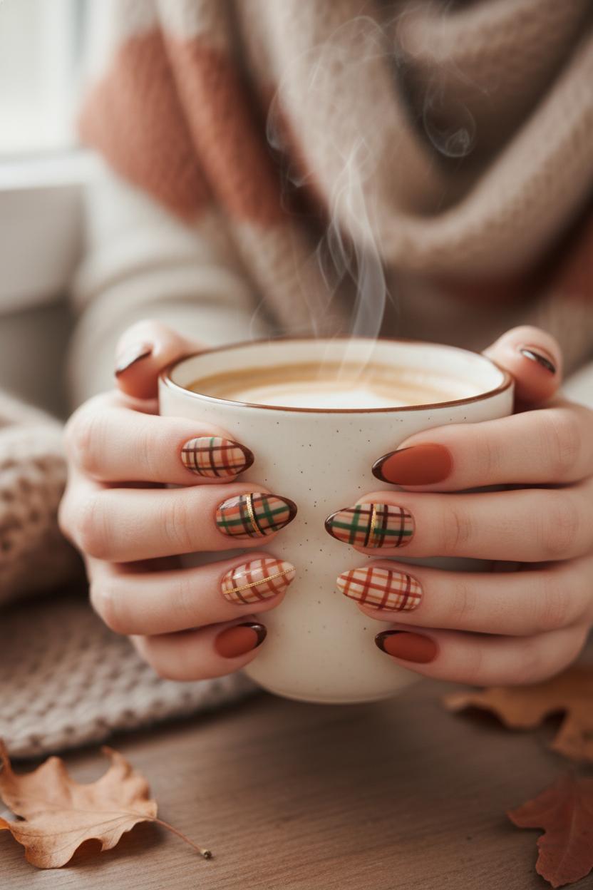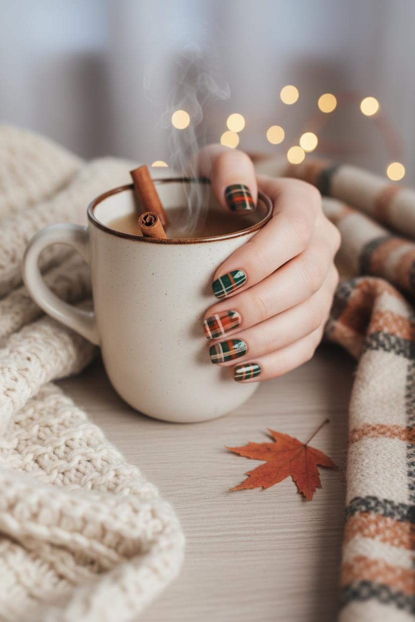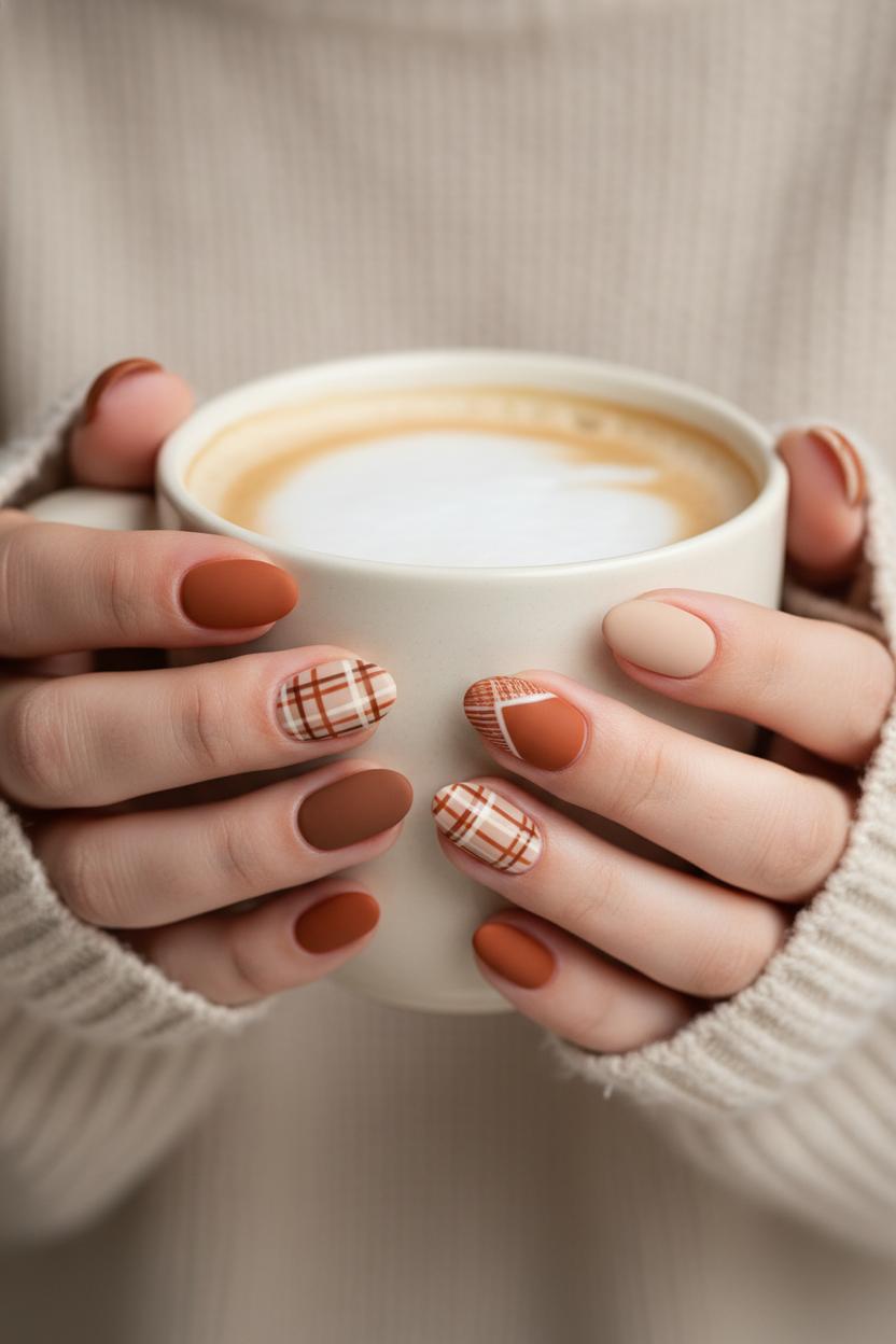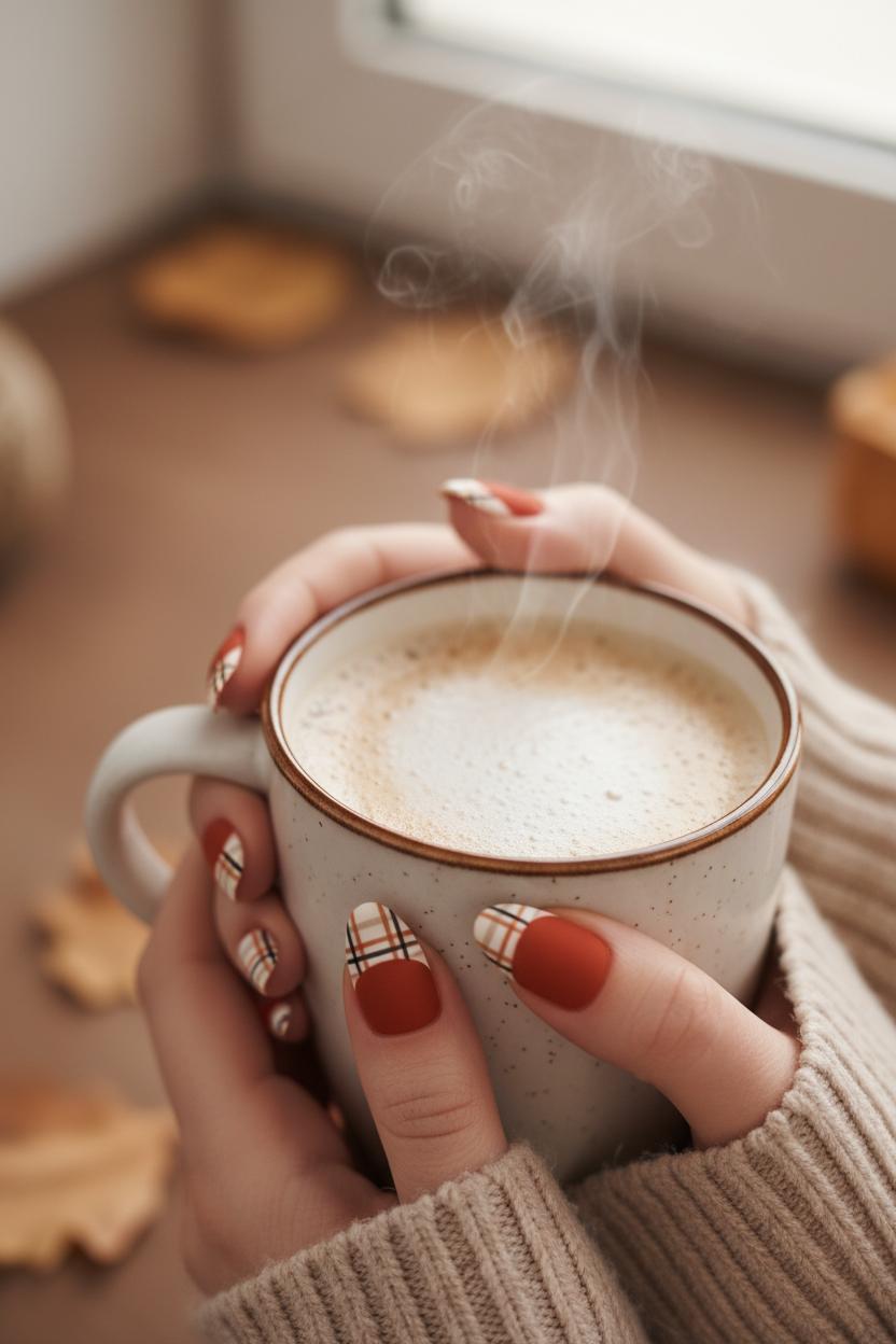 To keep everything soft and snuggly, limit high-contrast shades to the accents and let warm neutrals do the heavy lifting. Plaid nails feel chic when you restrict the palette to two or three hues and keep the lines fine. Seal with matte on most fingers and leave one glossy accent if you like a little contrast. The result is simple, comfy, and endlessly pin-able—a small, stylish nod to fall that looks just as good wrapped around a mug as it does peeking out from your sleeves.