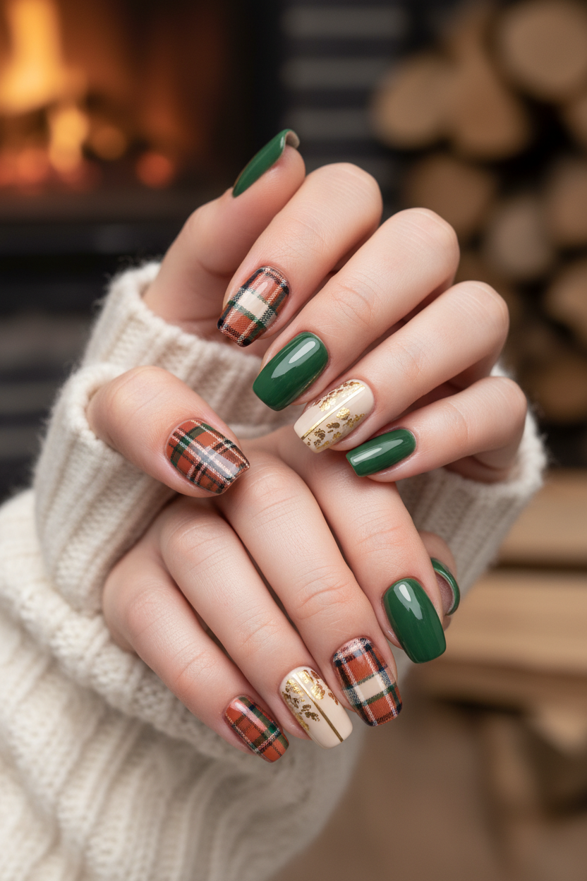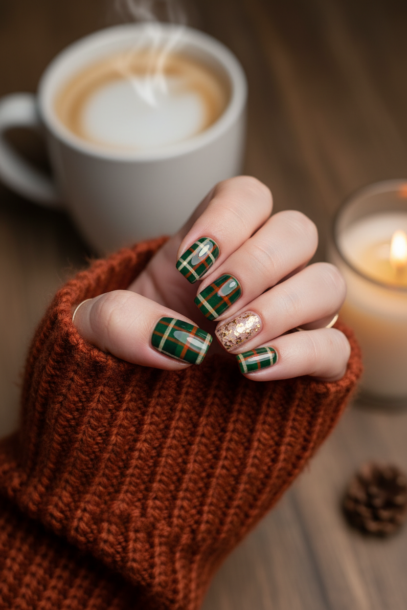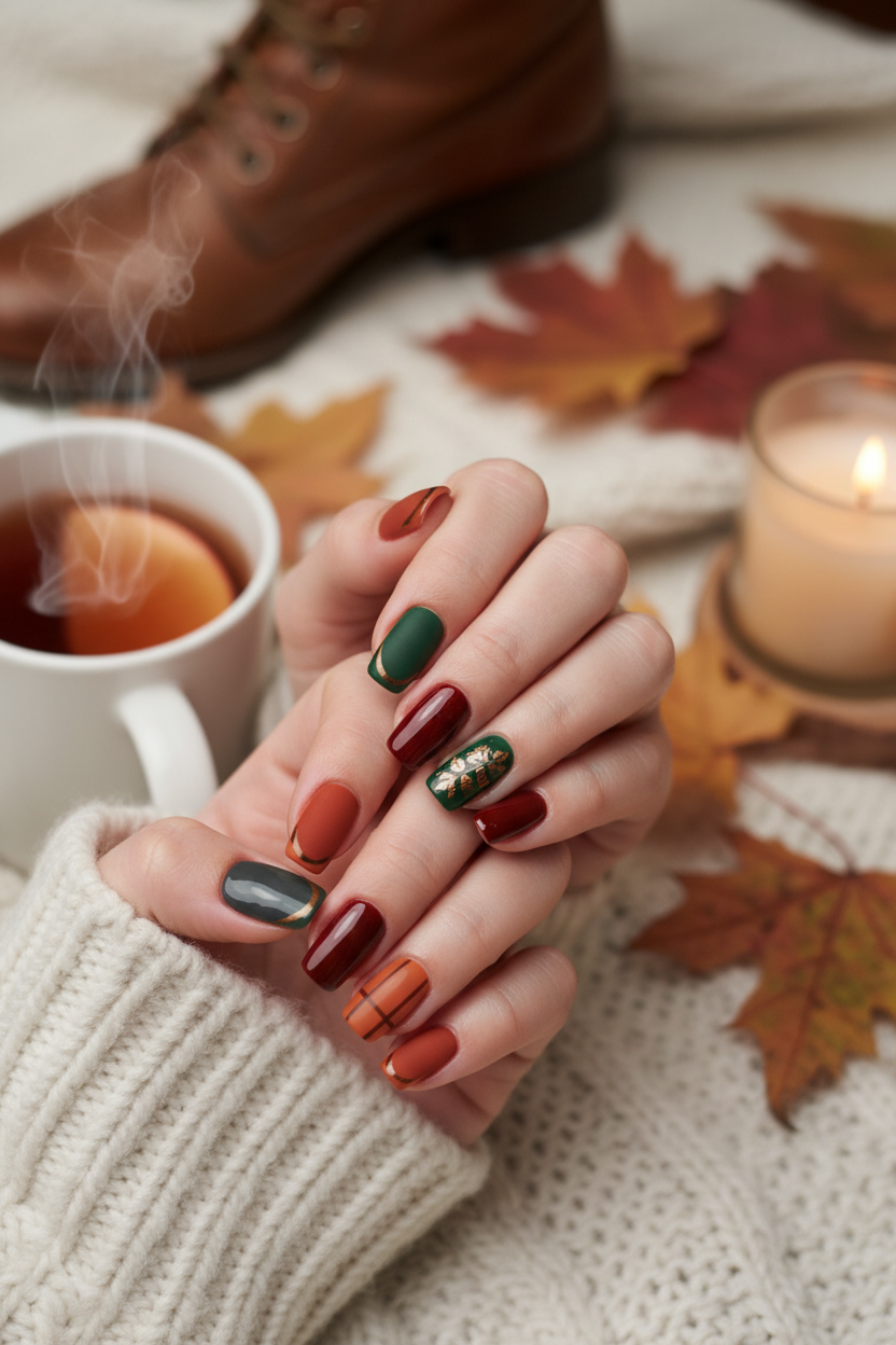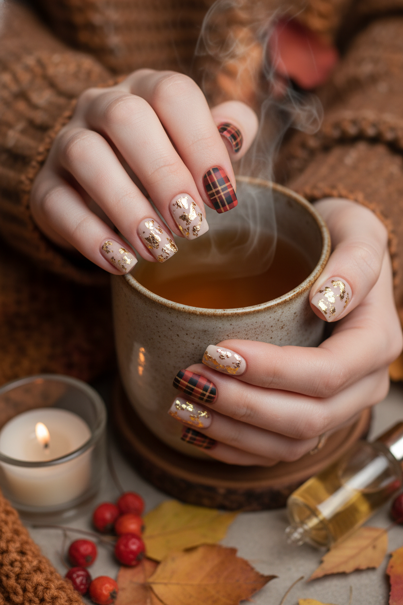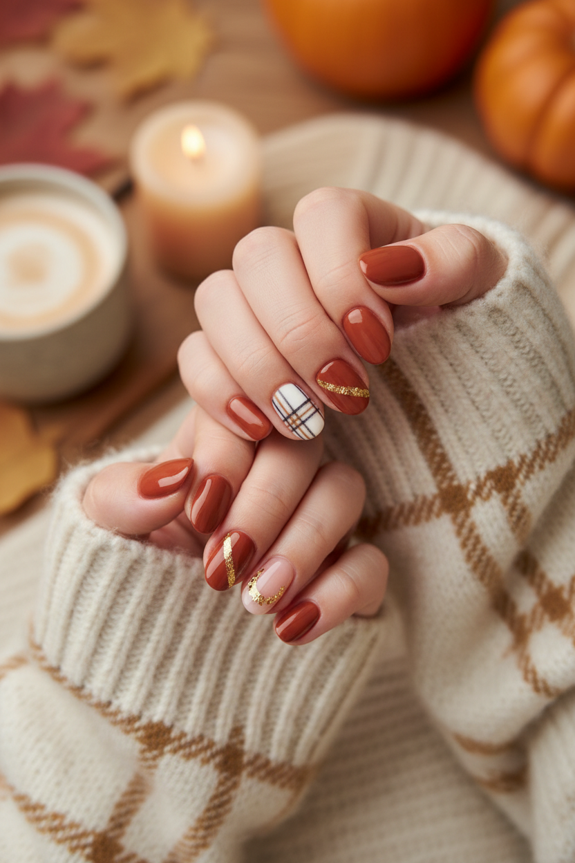 Cozy Fall Nail Designs: Rust, Plaid & Gold Leaf