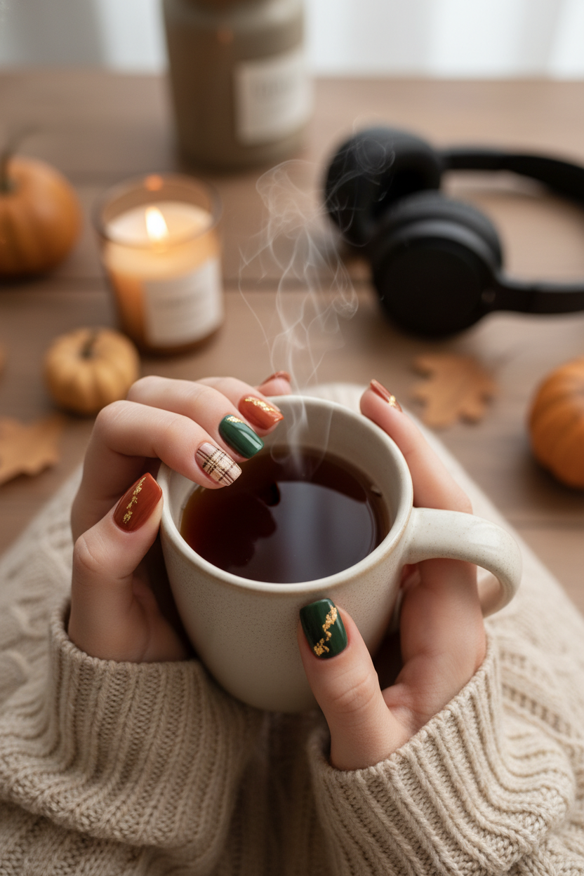 To pull the whole look together, think balance: two rust solids, one plaid, one with gold foil accents, and maybe a negative-space nail to let things breathe. Keep the palette cohesive—shared tones across your plaids and foils—so the set feels curated, not chaotic. Short nails look polished with micro-foil half moons; longer shapes can handle bolder plaid panels and statement tips. Finish with a nourishing cuticle oil to melt in that just-left-the-salon glow. These layered fall nail designs are proof that a little mixing makes a lot of magic—soft, warm, and perfectly ready for sweater weather.