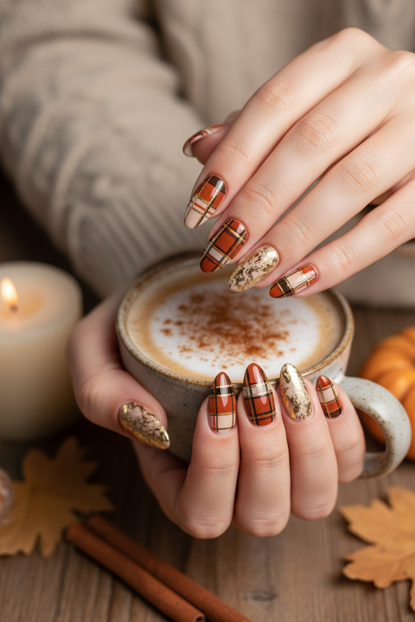 Mix-and-match magic: fall nail designs blending rust, plaid nails, and gold leaf