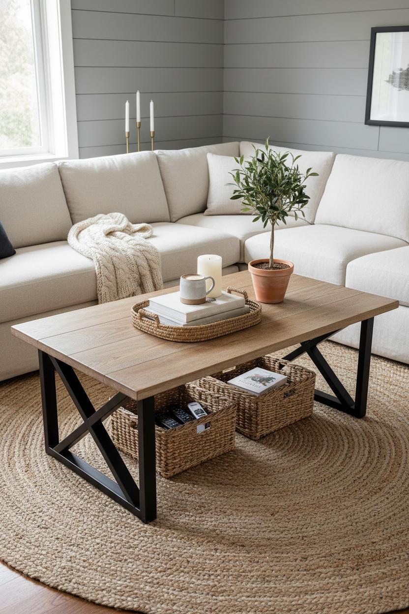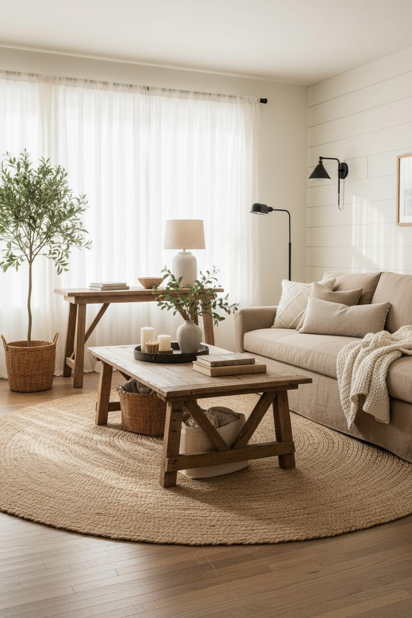 Next, layer in pieces that invite people to sit and stay awhile. Ground the seating area with a jute area rug for earthy texture, then anchor it with a sturdy farmhouse coffee table that can handle movie-night snacks and morning mugs alike. Add height and a hint of color with olive tree decor in a woven planter, and scatter in neutral pillows for softness. For instant warmth, drape a chunky knit blanket over the arm of the sofa—bonus points if it beckons you in for an afternoon nap. Keep lighting warm and welcoming: table lamps with linen shades, maybe a black metal sconce for a little edge. Style trays with candles and a small bowl of matches, tuck throws in baskets, and let a few imperfections show—scratches on wood, a well-loved book spine, the patina that tells a story. When the textures are layered and the tones are quiet, your cozy living room becomes the heart of your home: modern farmhouse, effortlessly lived-in, and endlessly inviting.