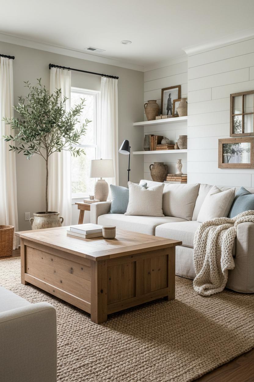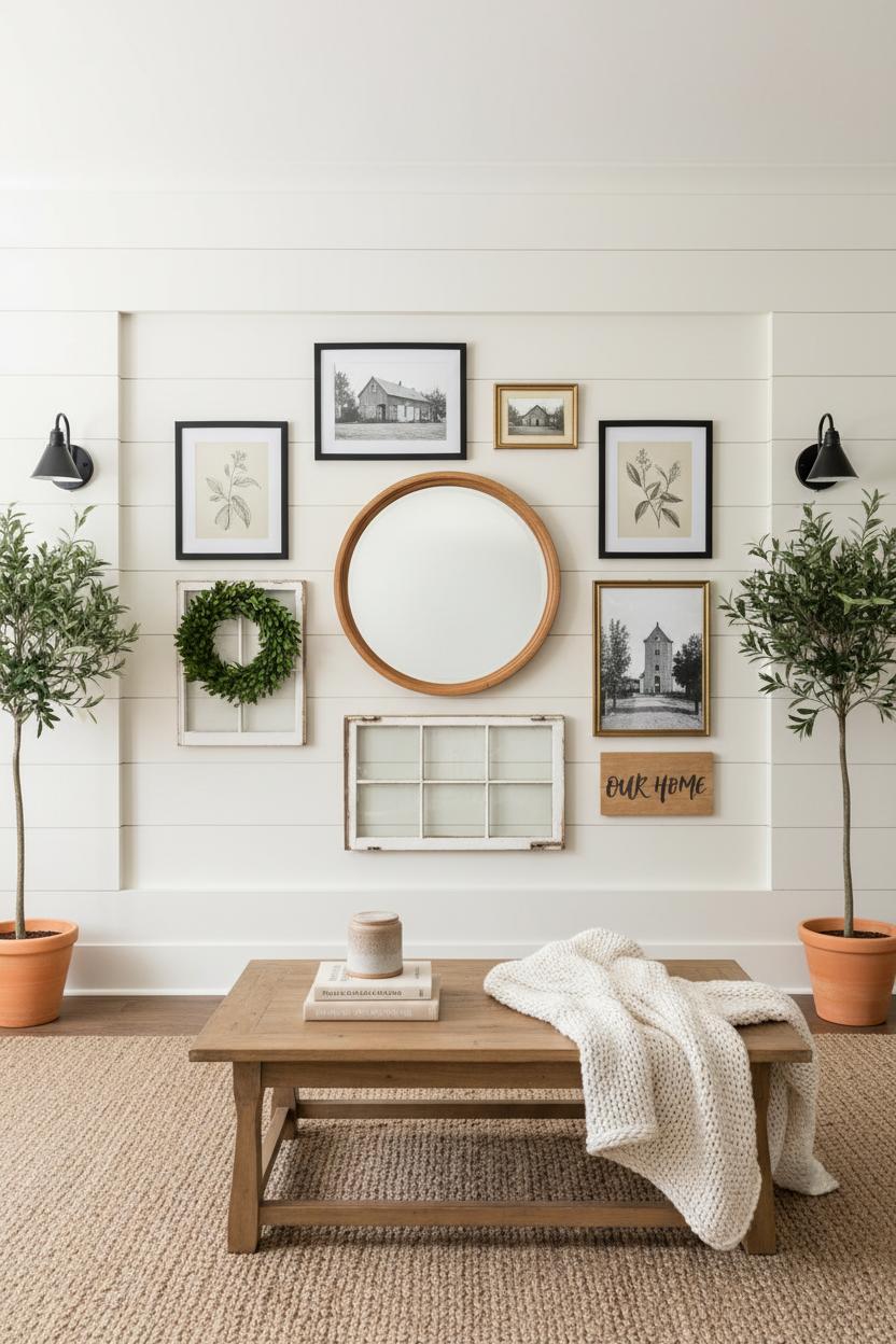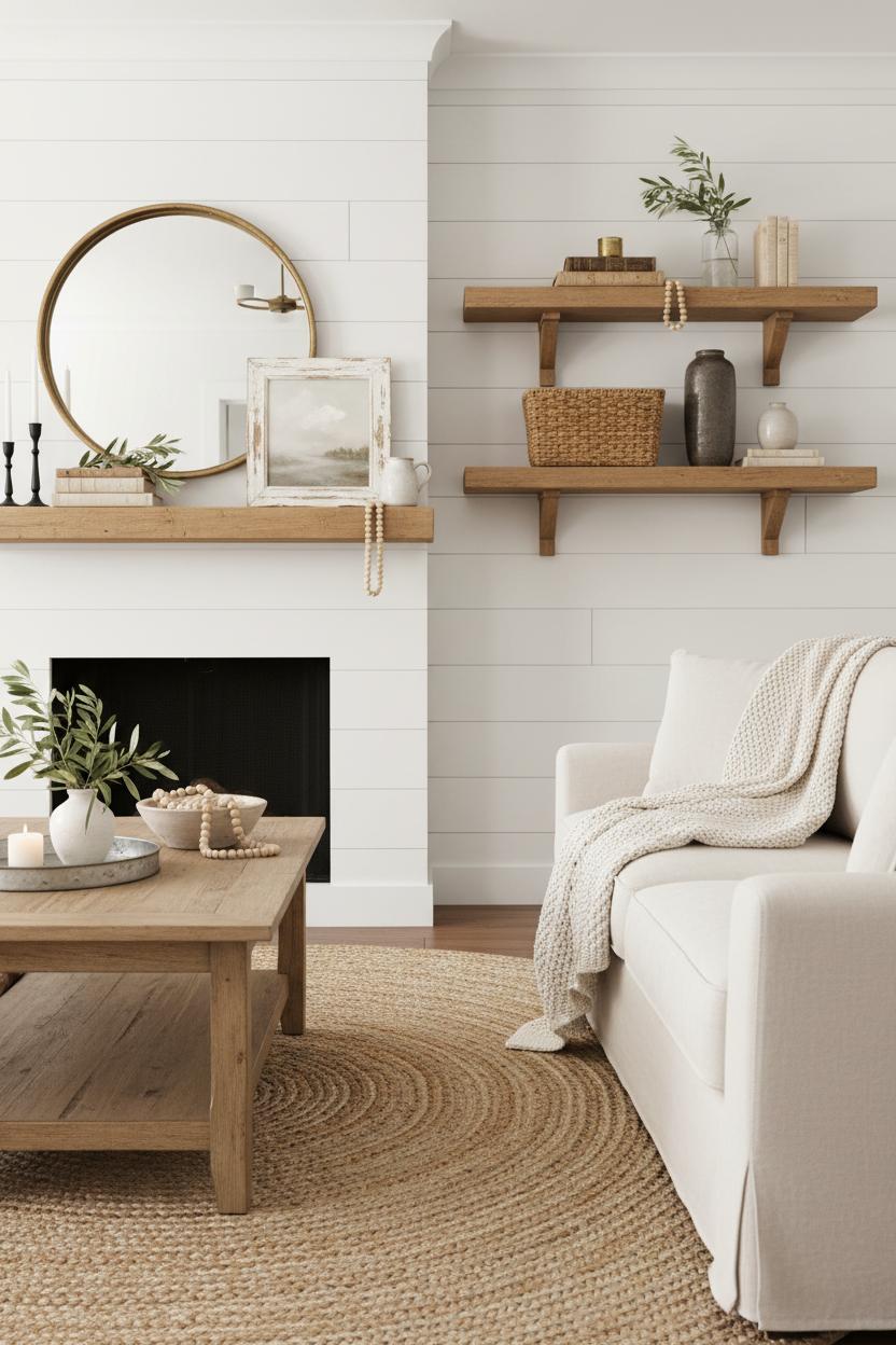 When it comes to styling a shiplap wall, think of it as your cozy living room’s built-in picture frame—the soft lines make anything you hang feel intentional and layered. Start with one strong anchor piece to set the tone: an oversized round mirror to bounce light and open up a farmhouse living room, or a vintage-inspired landscape print for that collected, rustic decor vibe. Around your anchor, layer a mix of smaller art—botanical sketches, black-and-white farmhouse photos, or even a salvaged window frame for texture. Let the shiplap lines guide your spacing, but don’t feel married to symmetry; an organically balanced gallery with varied frame finishes (matte black, warm oak, and a hint of antique brass) keeps things modern farmhouse without feeling matchy. Tie the wall to the rest of the space by echoing those tones on your farmhouse coffee table with stacked books, a stoneware candle, and a soft chunky knit blanket draped nearby, all grounded by the nubby texture of a jute area rug.