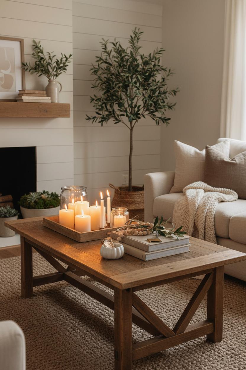 When the big pieces are in place, it’s the little layers that turn a farmhouse living room into a true retreat. Start with candles to set the mood—cluster a few creamy pillars and slim tapers on a wooden tray, then tuck them onto your farmhouse coffee table beside a small vase or a scalloped match striker. Choose cozy scents like vanilla, cedar, or cashmere so the whole room feels like a hug at the end of the day. If you’ve got a shiplap wall, let candlelight bounce off that soft texture for extra warmth; renters can even fake the look with shiplap peel and stick for an instant modern farmhouse backdrop. Mixing heights is key: a chunky hurricane, a petite votive, maybe a ribbed glass jar—all in soft neutrals so the glow takes center stage.