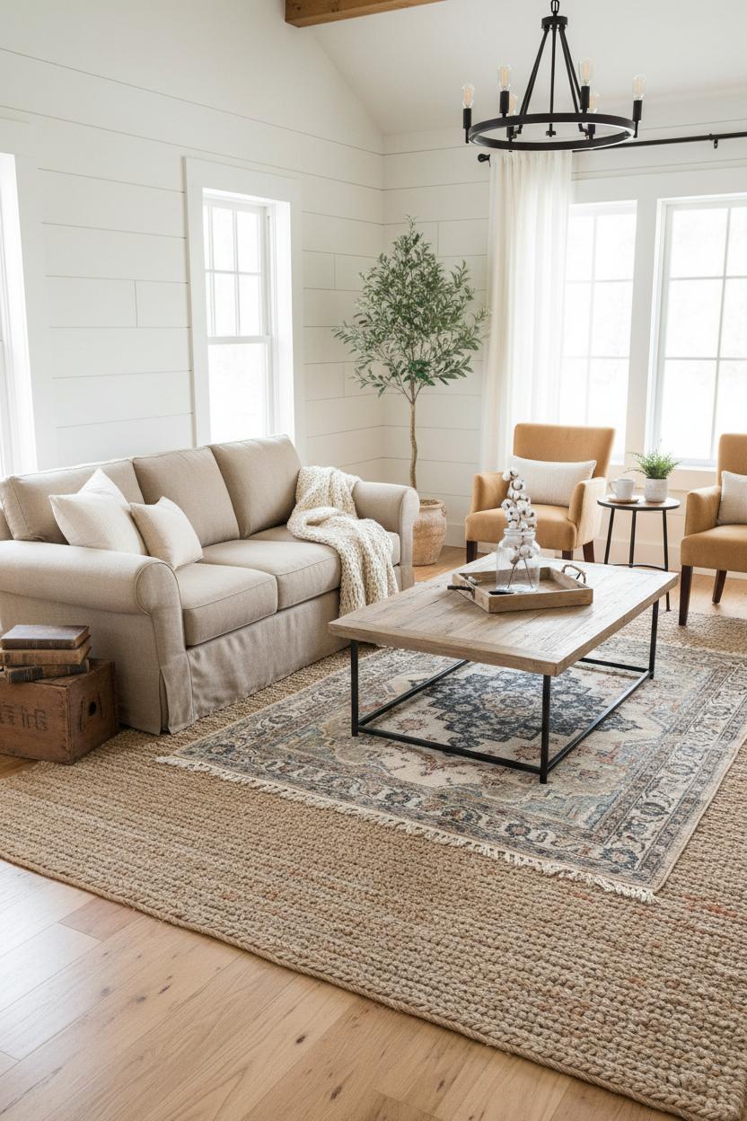 To tie the look together, let texture be your theme. A shiplap wall behind the sofa echoes the organic feel of the floor underfoot; if you’re renting or not ready for nails, shiplap peel and stick panels give you the same vibe without the commitment. Tuck a bit of life into the corner with olive tree decor for that airy Mediterranean note that still feels right at home in modern farmhouse spaces. Keep the palette warm and layered—oatmeal, camel, charcoal, and creamy whites—so the jute shines without overpowering. Practical perk: jute hides everyday dust and is easy to maintain with regular vacuuming and a rug pad for cushioning. The result is a welcoming, lived-in base that invites barefoot mornings, movie nights, and all the cozy moments in between.