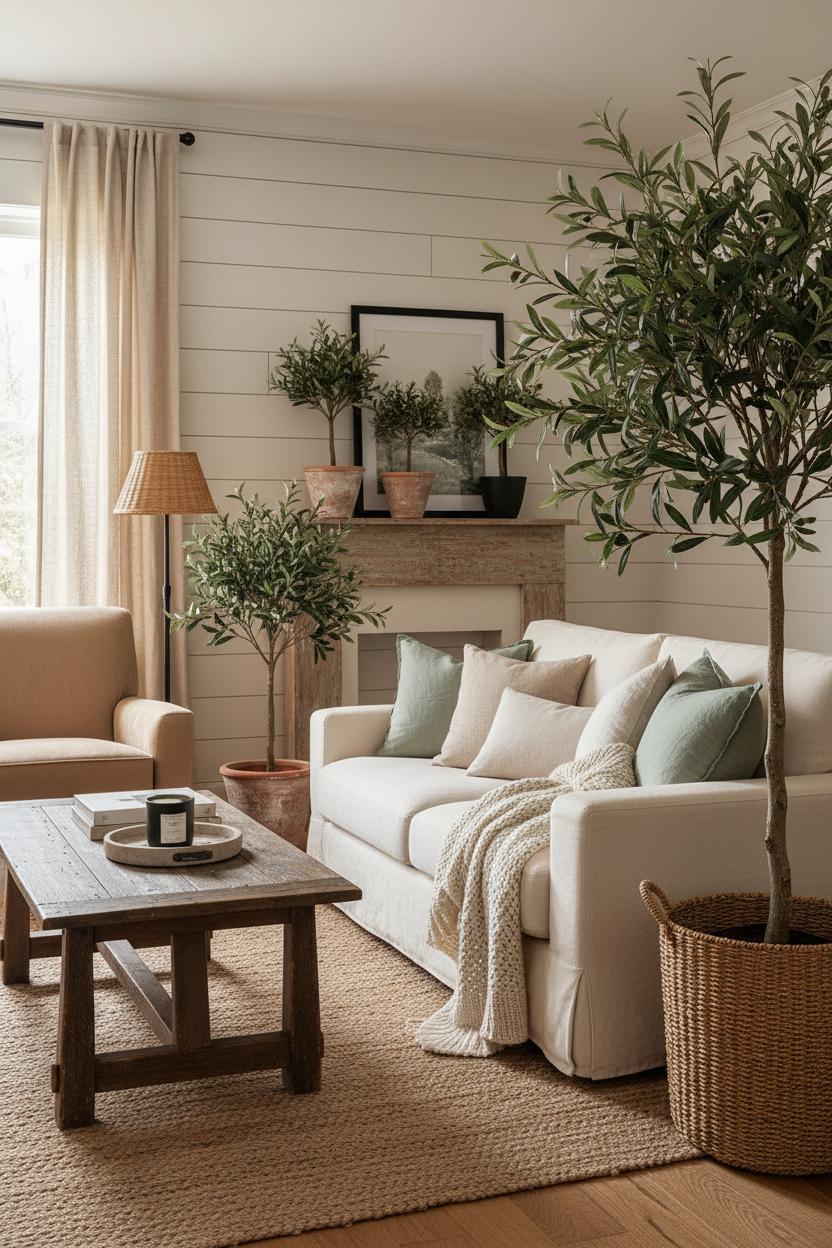 If your space is craving a little life, olive tree decor is the simplest way to invite a soft, effortless dose of nature into your farmhouse living room. Those silvery green leaves feel timeless and soothing, and they blend beautifully with both rustic decor and a cleaner, modern farmhouse vibe. Try tucking a tall faux olive tree into a woven basket beside a shiplap wall to soften the lines, or let a medium-size tree anchor an empty corner near your reading chair. For a layered look, cluster a couple of petite potted branches on the mantel or console, mixing weathered terracotta with matte black planters for contrast. The key is keeping the palette calm—sage, oatmeal, warm wood, and a touch of black—so the greenery becomes the quiet star.
