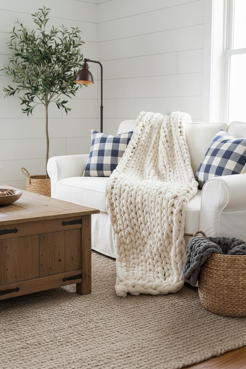 Nothing softens a room faster than a chunky knit blanket thrown just-so across your sofa, and in a farmhouse living room it feels like an instant hug. The oversized stitches add that tactile, nubby texture rustic decor is known for, but with a fresh, modern farmhouse twist that keeps things feeling airy rather than heavy. Drape a creamy chunky knit blanket over the arm of a slipcovered couch or fold it loosely at the foot of your favorite armchair so it spills to the floor like a cozy cloud. Let it play against the rougher weave of a jute area rug and the timeworn wood of a farmhouse coffee table for a rich mix of textures that reads layered and lived-in. If you’ve got a shiplap wall, the blanket’s plush loops soften the crisp lines; no shiplap yet? Try shiplap peel and stick for a renter-friendly backdrop that instantly elevates your cozy living room without a single nail. Add a pot of olive tree decor beside the sofa for a gentle hit of green—the matte leaves are the perfect foil to all that cushy knit.