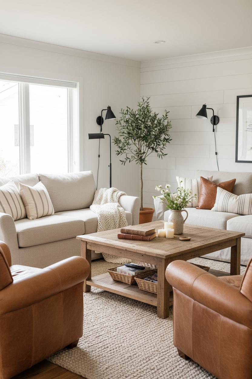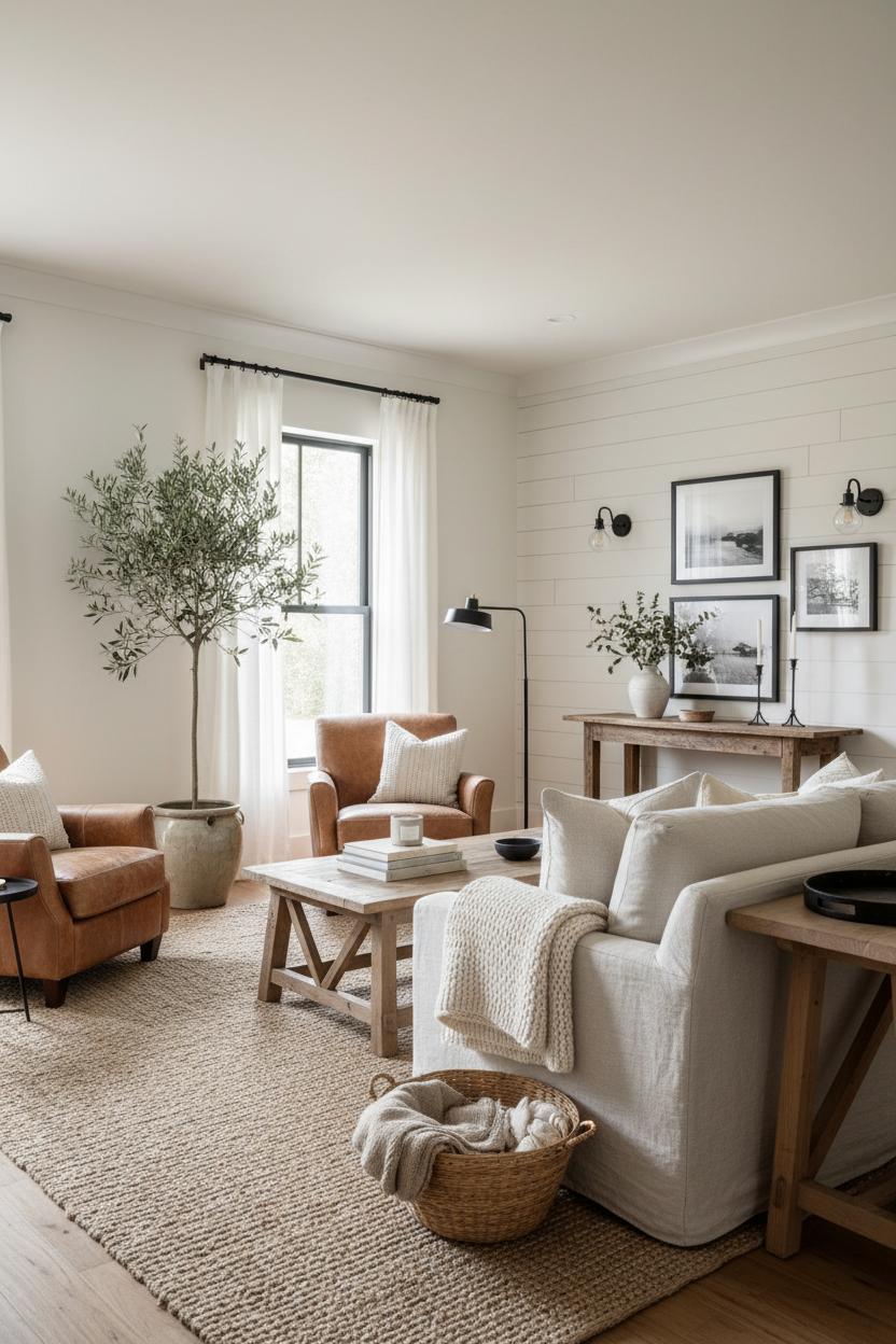 Nothing welcomes a crowd quite like the easygoing mix of a slipcovered sofa and a pair of buttery leather chairs. In a farmhouse living room, that pairing strikes the perfect balance between breezy and grounded: the sofa brings light, washable comfort, while the chairs add cozy, clubby curves and a little patina that only gets better with time. Arrange them facing each other to encourage conversation, then anchor the whole scene with a sturdy farmhouse coffee table and a chunky jute area rug that layers in texture underfoot. A shiplap wall behind the seating instantly reads modern farmhouse, and if you’re renting or not ready for nails and sawdust, shiplap peel and stick is a weekend-friendly shortcut that delivers the same charming lines. Keep the palette soft—oatmeal, cream, and warm camel—then thread in contrast with black sconces or a matte iron floor lamp so the room feels collected, not theme-y. The result is a cozy living room that invites everyone to kick off their shoes and stay awhile.