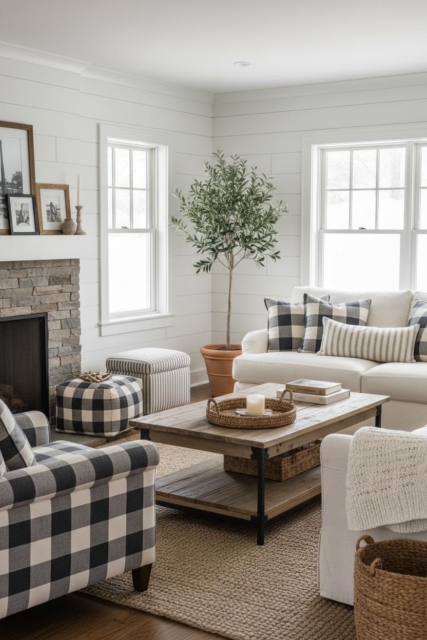 Layering matters just as much as pattern. A nubby jute area rug sets an earthy foundation, while a chunky knit blanket draped over the armchair adds cozy, touchable texture that plays nicely with clean-lined stripes. Anchor the seating with a farmhouse coffee table—weathered wood for rustic decor warmth, or a black metal base for a wink of modern edge—and stack it with a woven tray, a candle, and a favorite book to invite slow, quiet moments. Slip a petite striped ottoman under the window or a buffalo check pouf beside the hearth to echo the motif without overwhelming the eye. For height and softness, an airy olive tree decor piece in a terracotta pot brings subtle color and a gentle, organic shape that breaks up all the straight lines.